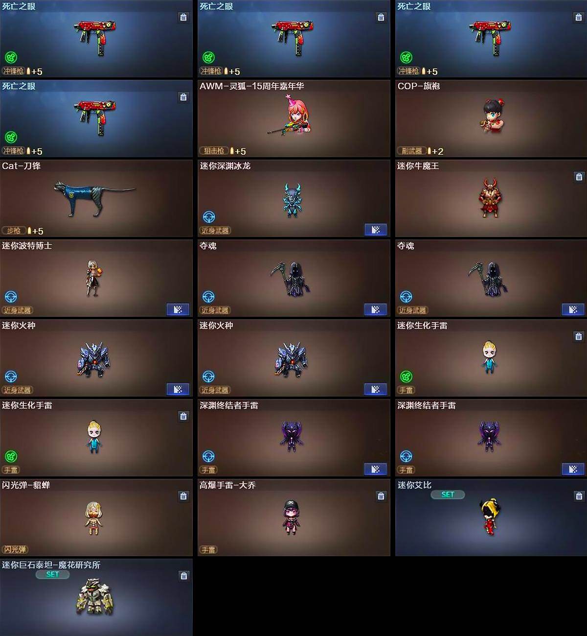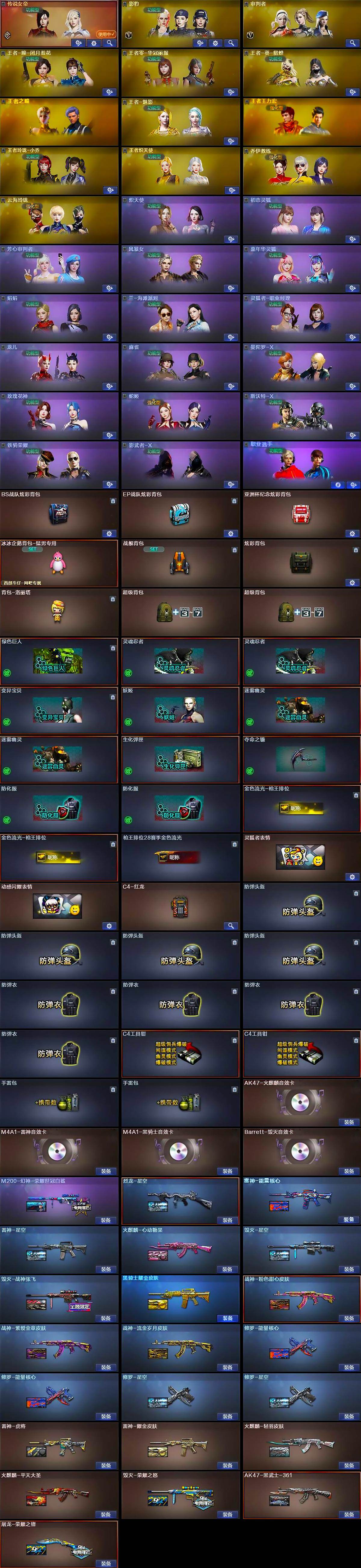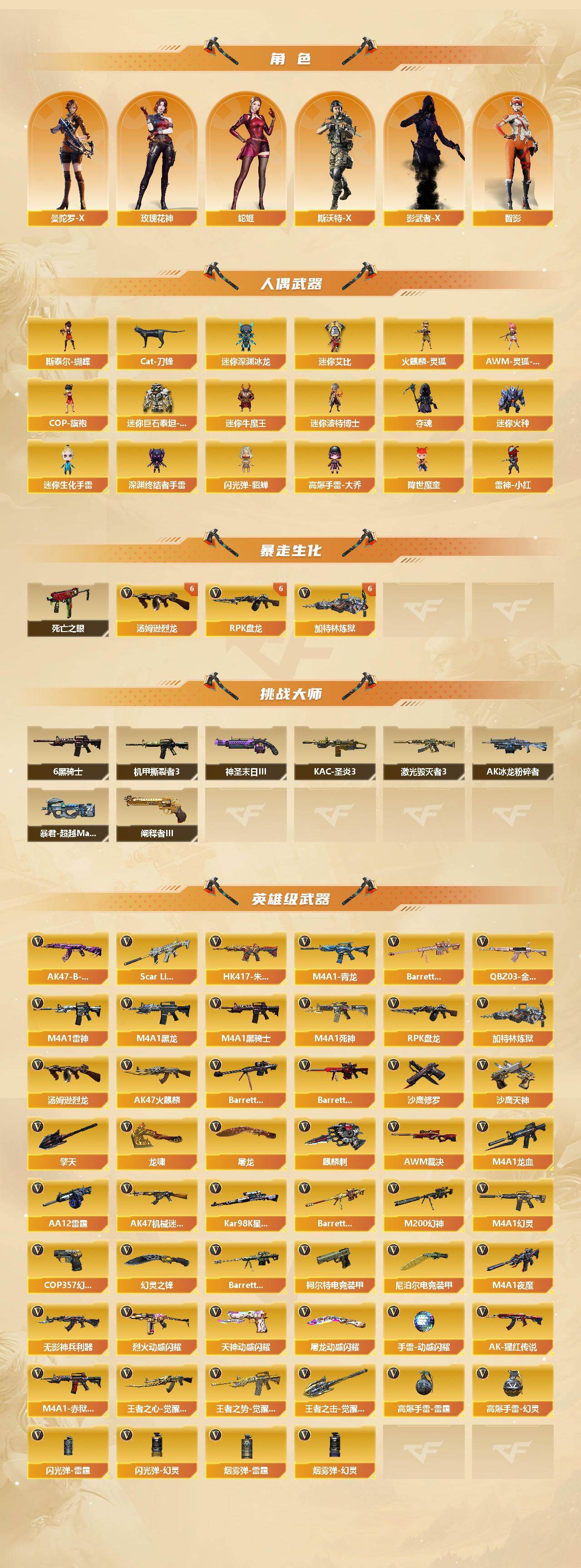 【热门武器】:传说暗裔*2,QBZ03-金色蔷薇,Scar Light-白虎,HK417-朱雀,M4A1-青龙,M200-幻神,死亡之眼*4,Kar98K-星神,金色小号,Cat-刀锋,M4A1-黑骑士*6,汤姆逊-烈龙*6,RPK-盘龙*6,加特林-炼狱*6,斯泰尔-蝴蝶,降世魔童,雷神-小红,COP 3