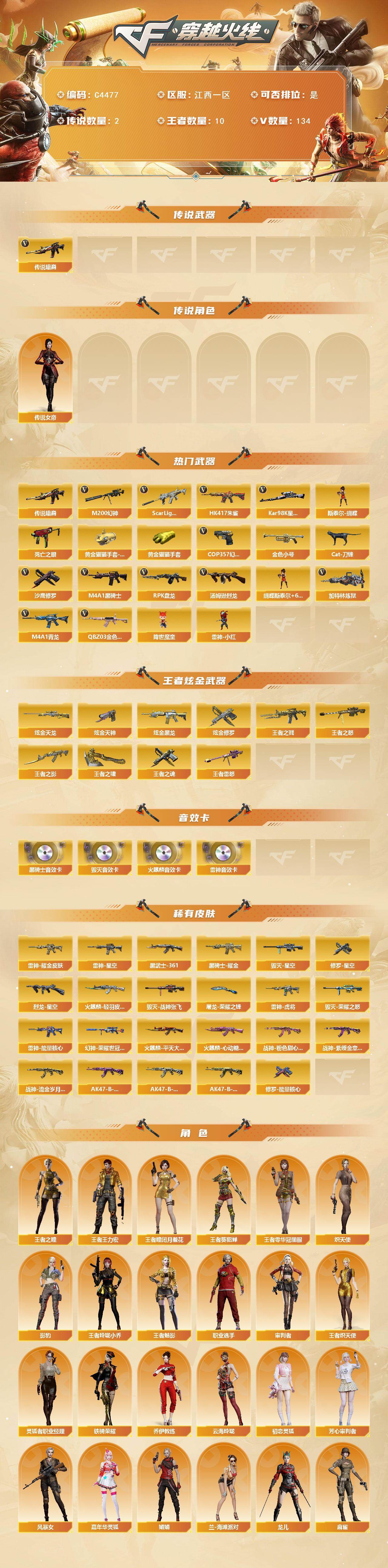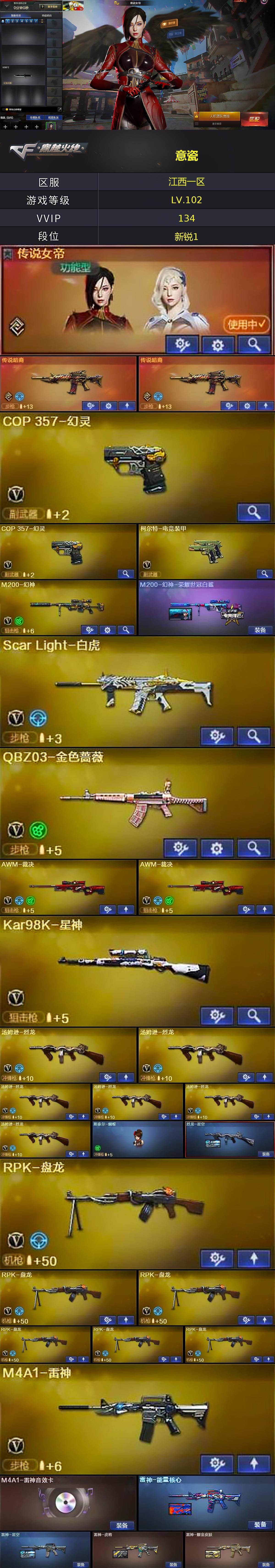 江西一区-134V-10王者-5炫金【传说武器】:传说暗裔*2【传说角色】