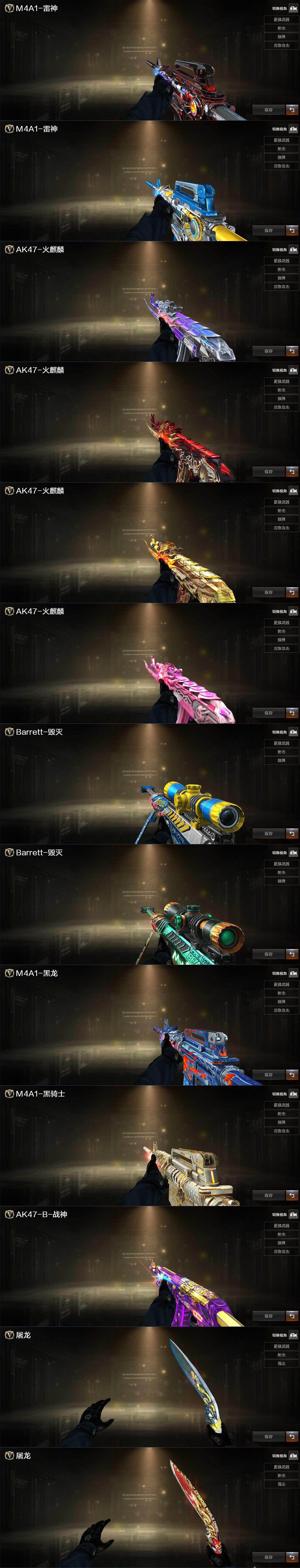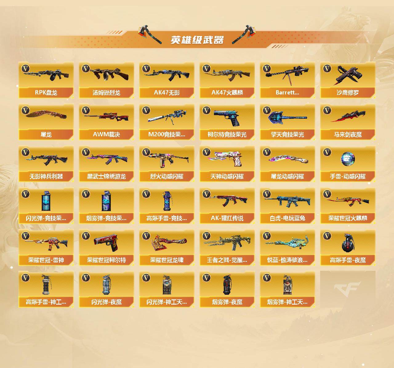 【热门武器】:传说梦魇,QBZ03-金色蔷薇,M200-竞技荣光,荣耀世冠-火麒麟,荣耀世冠-雷神,白虎-电玩蓝兔,荣耀世冠-柯尔特,M4A1-黑骑士,汤姆逊-烈龙*6,RPK-盘龙*6,斯泰尔-蝴蝶,沙鹰-修罗,荣耀世冠-龙啸