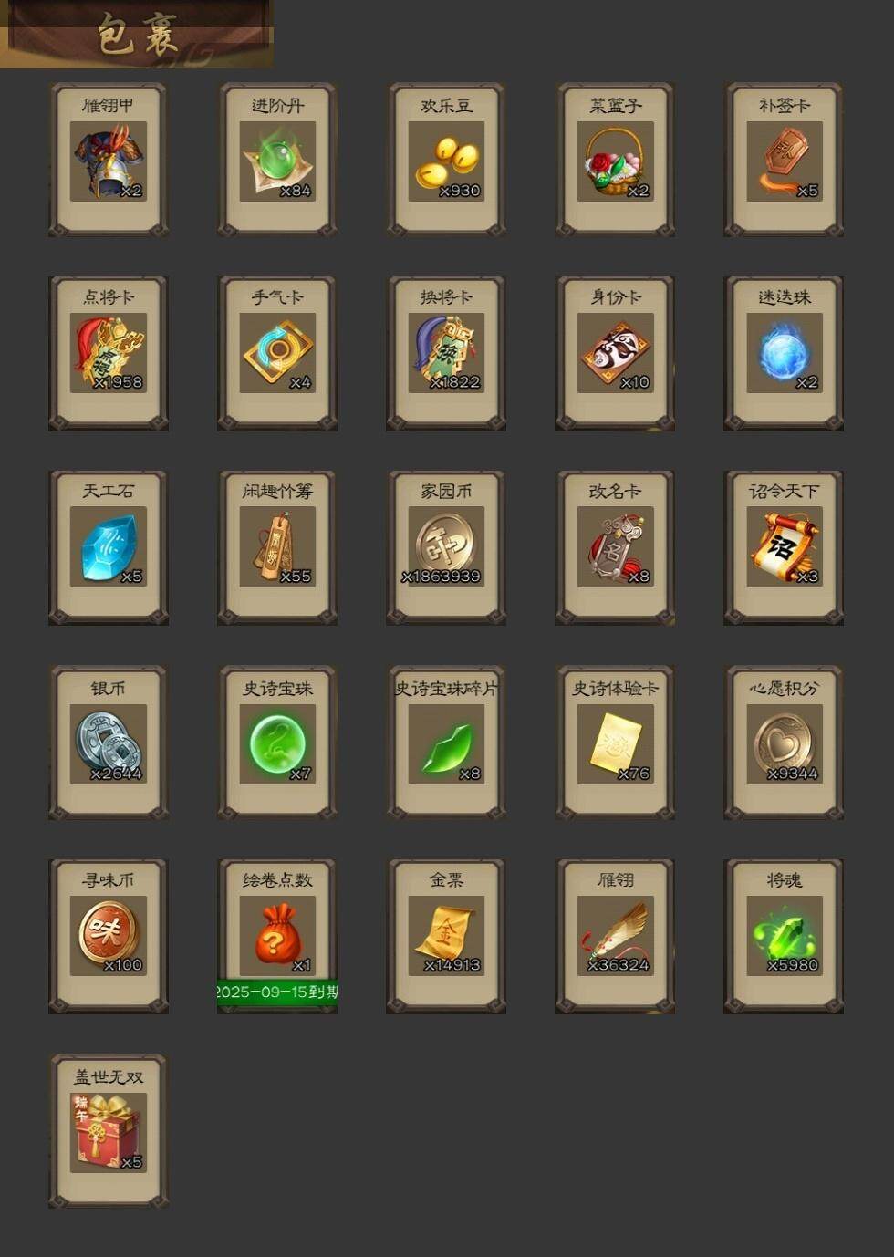 官阶:骠骑将军;VIP等级:VIP9;史诗武将数量:24;动态皮肤数量:21;武将总数:267;史诗宝珠数量:7;将魂数量:5980;神将:6;魏国史诗武将:4;蜀国史诗武将:4;吴国史诗武将:3;群史诗武将:5