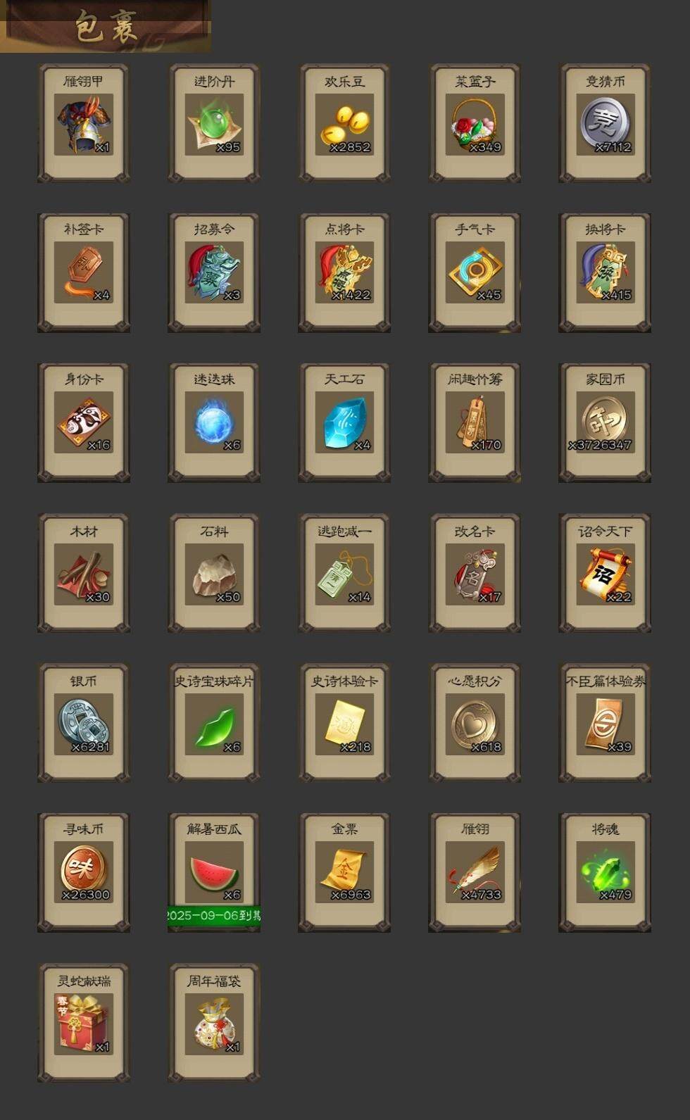 官阶:大将军;VIP等级:VIP10;史诗武将数量:33;动态皮肤数量:57;武将总数:358;史诗宝珠数量:0;将魂数量:0;神将:5;魏国史诗武将:31;蜀国史诗武将:91;吴国史诗武将:81;群史诗武将:88