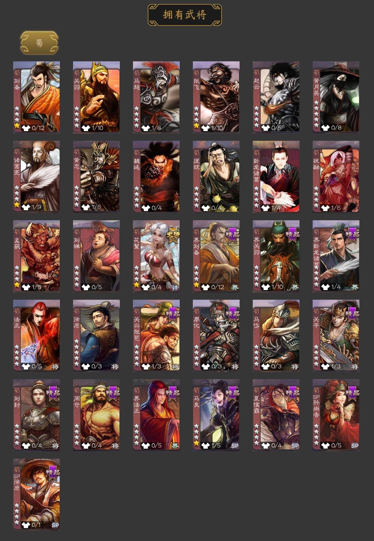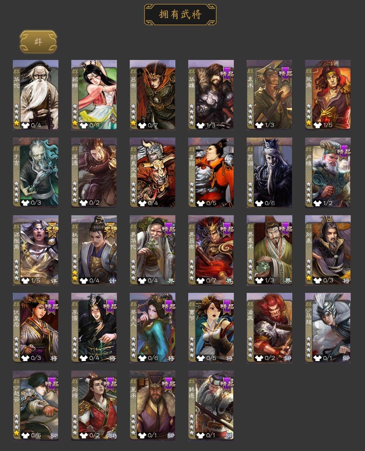 官阶:先锋将军;VIP等级:VIP1;史诗武将数量:4;动态皮肤数量:0;武将总数:119;史诗宝珠数量:13;将魂数量:1007;神将:0;魏国史诗武将:0;蜀国史诗武将:1;吴国史诗武将:1;群史诗武将:2