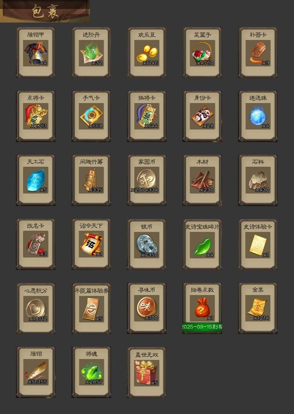 官阶:大将军;VIP等级:VIP10;史诗武将数量:43;动态皮肤数量:46;武将总数:350;史诗宝珠数量:0;将魂数量:2857;神将:6;魏国史诗武将:14;蜀国史诗武将:13;吴国史诗武将:7;群史诗武将:12