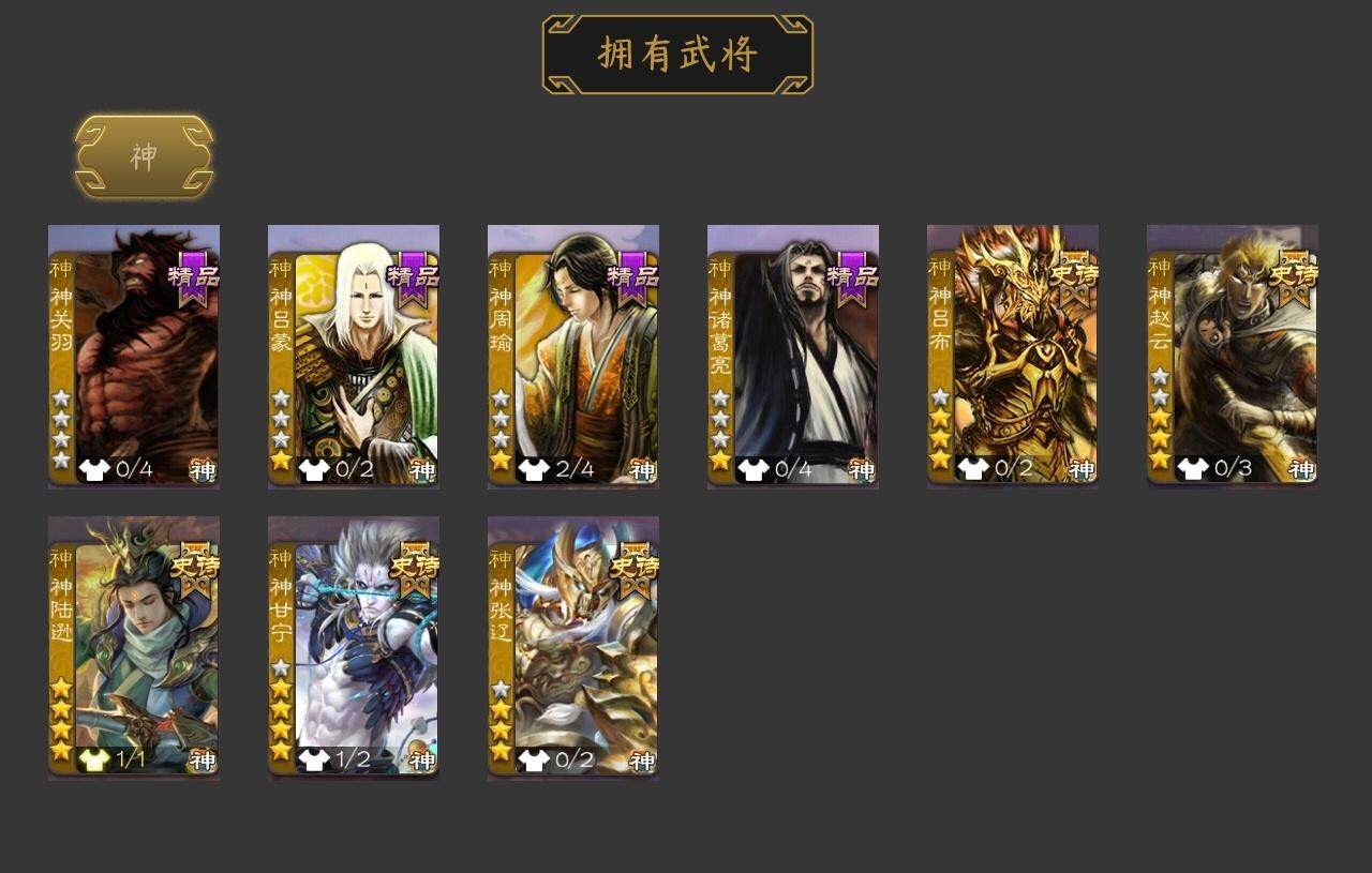 神吕布,神赵云,神陆逊,神甘宁,神张辽,神关羽,神吕蒙,神周瑜,神诸葛亮,SP司马昭,星周不疑,羊徽瑜,王元姬,王朗,马钧,界钟会,界于禁,界曹真,嵇康,郝昭,曹婴,曹纯,戏志才,