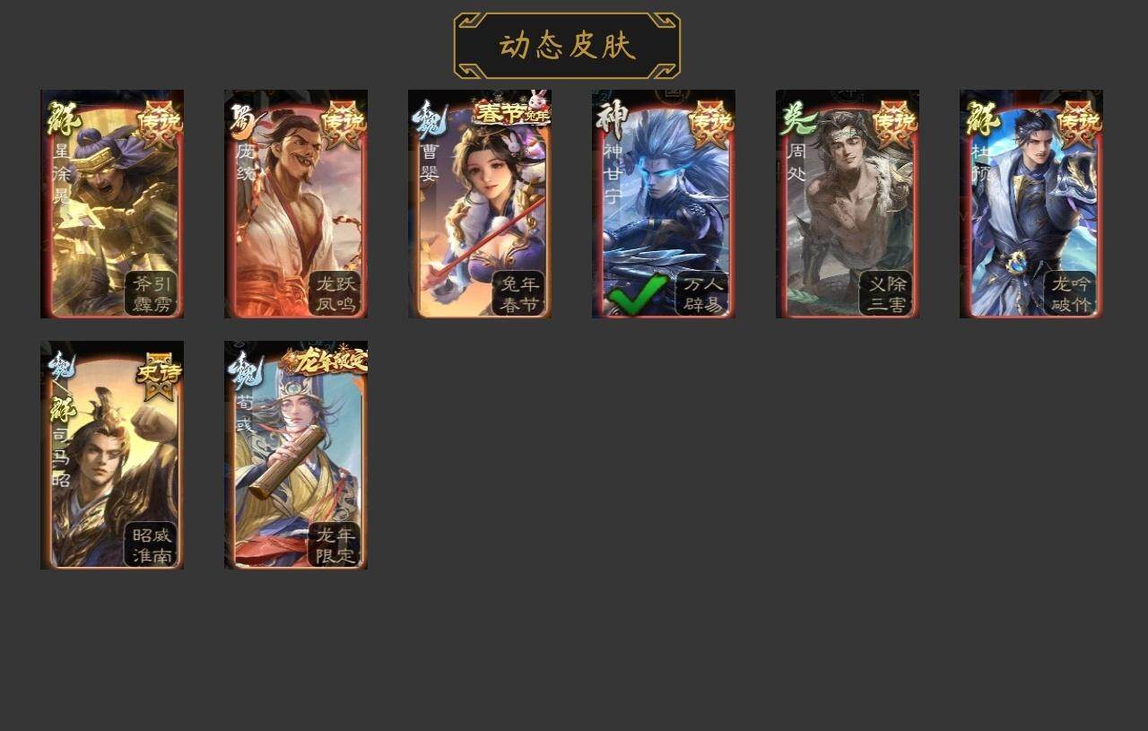 神吕布,神甘宁,神吕蒙,魏-司马昭,郝昭,曹婴,曹纯,谋赵云,诸葛瞻,谯周,界朱然,界步练师,左慈,王允,审配,杜预,阎象,神甘宁-万人辟易(动态),曹婴-兔年春节(动态),司马昭-昭威淮南(动
