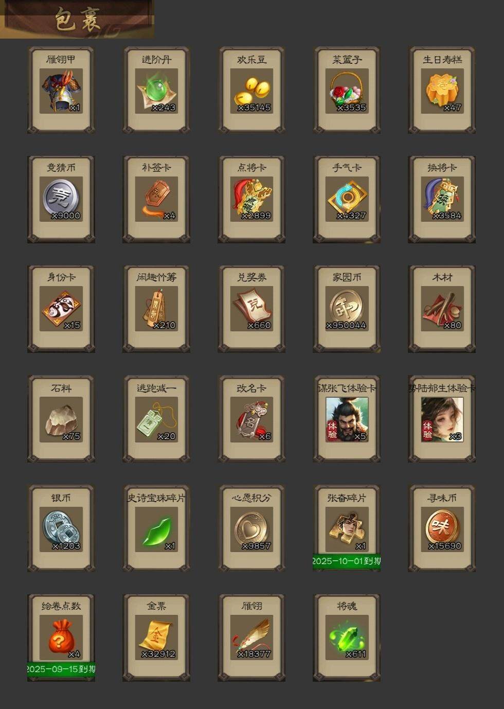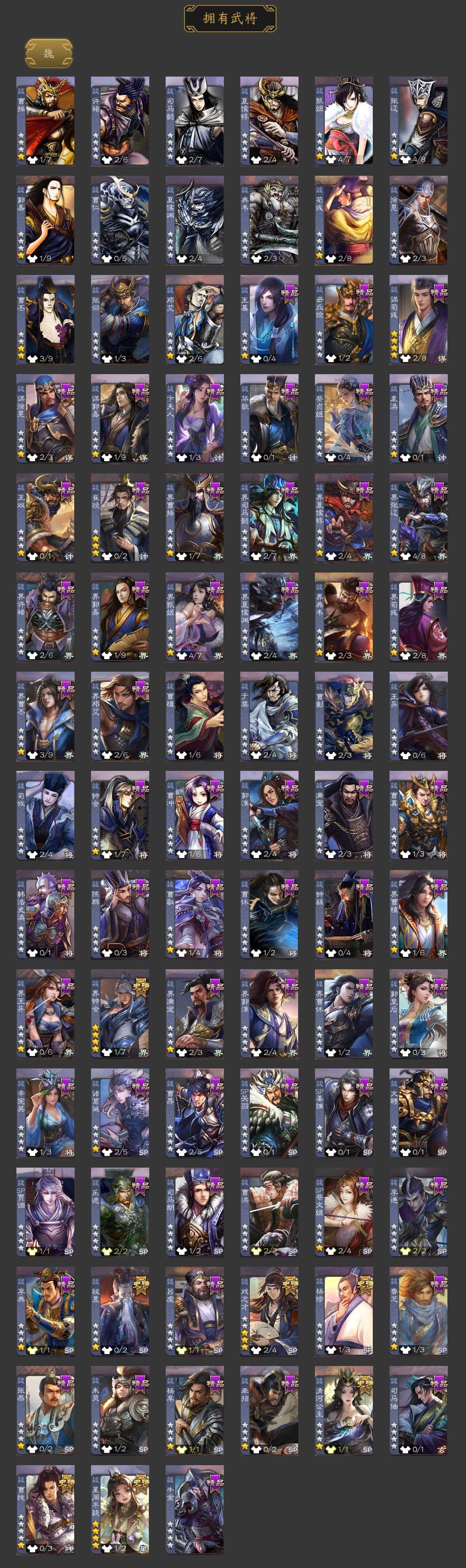 官阶:骠骑将军;VIP等级:VIP9;史诗武将数量:28;动态皮肤数量:26;武将总数:311;史诗宝珠数量:0;将魂数量:611;神将:6;魏国史诗武将:20;蜀国史诗武将:4;吴国史诗武将:1;群史诗武将:14
