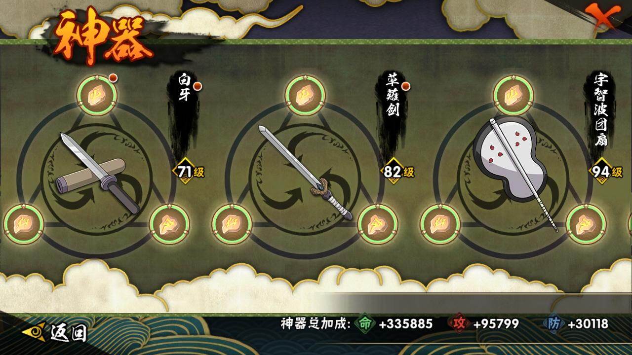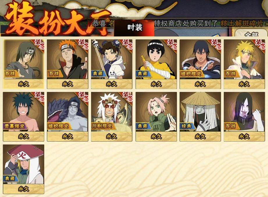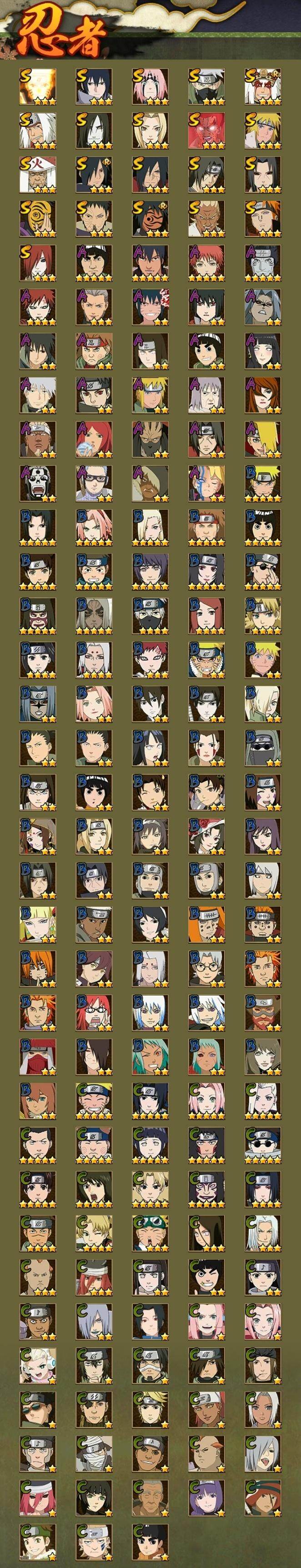 3星宇智波佐助「永恒万花筒」,3星宇智波斑「秽土转生·解」,3星神秘面具男「红夜之刃」,3星宇智波带土「忍界大战」,3星波风水门,3星漩涡鸣人「九喇嘛连结」,3星迈特凯「死门」,3星宇智波鼬「秽土转生」,3星宇智波鼬「须佐能乎」,3星神秘面具男,3星猿飞日斩,3星宇智波斑「木叶创立」,3星长门「秽土转生」,3星佩恩「天道」,3星纲手,3星春野樱「忍界大