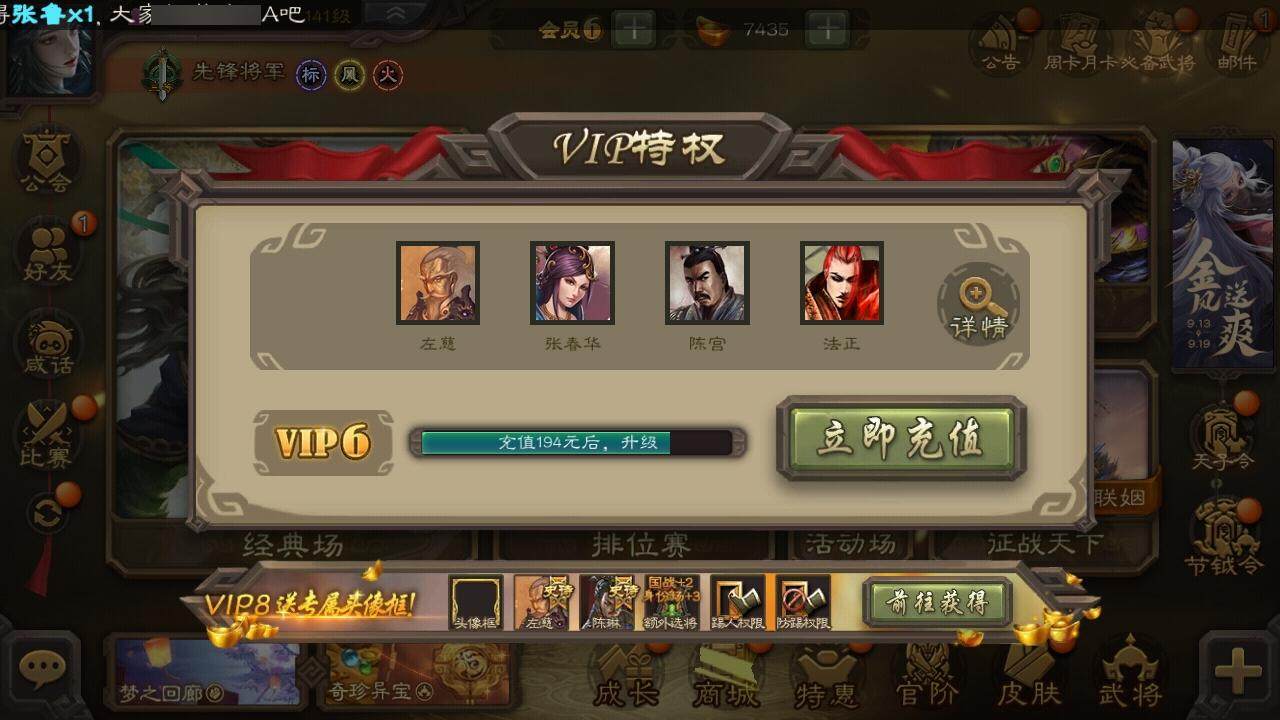 官阶:先锋将军;VIP等级:VIP6;史诗武将数量:5;动态皮肤数量:2;武将