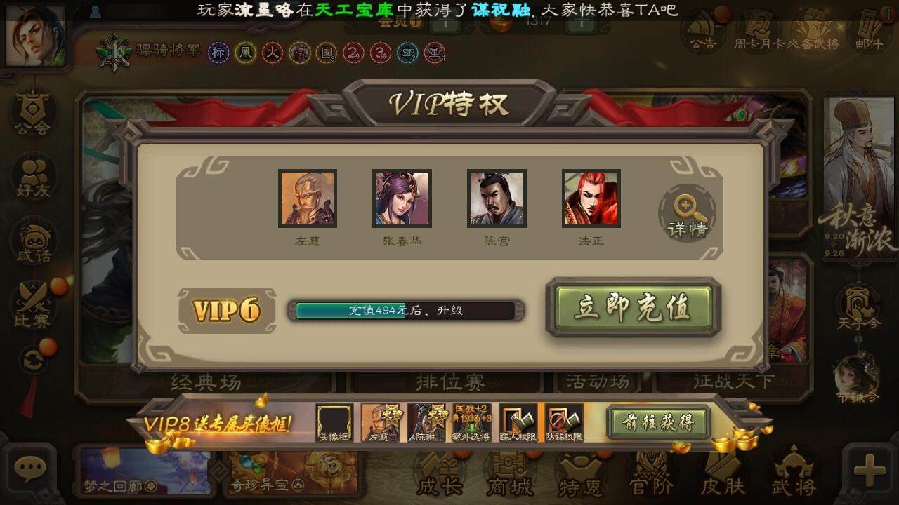 官阶:骠骑将军;VIP等级:VIP6;史诗武将数量:11;动态皮肤数量:13;