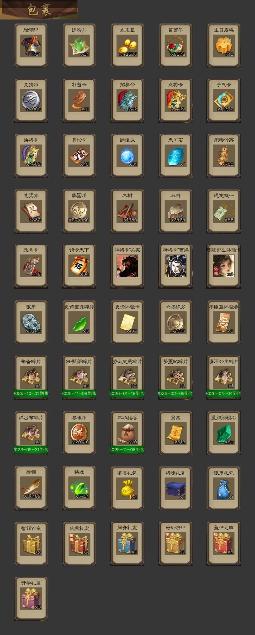 官阶:大将军;VIP等级:VIP8;史诗武将数量:49;动态皮肤数量:74;武将总数:404;史诗宝珠数量:0;将魂数量:5731;神将:7;魏国史诗武将:15;蜀国史诗武将:13;吴国史诗武将:6;群史诗武将:18