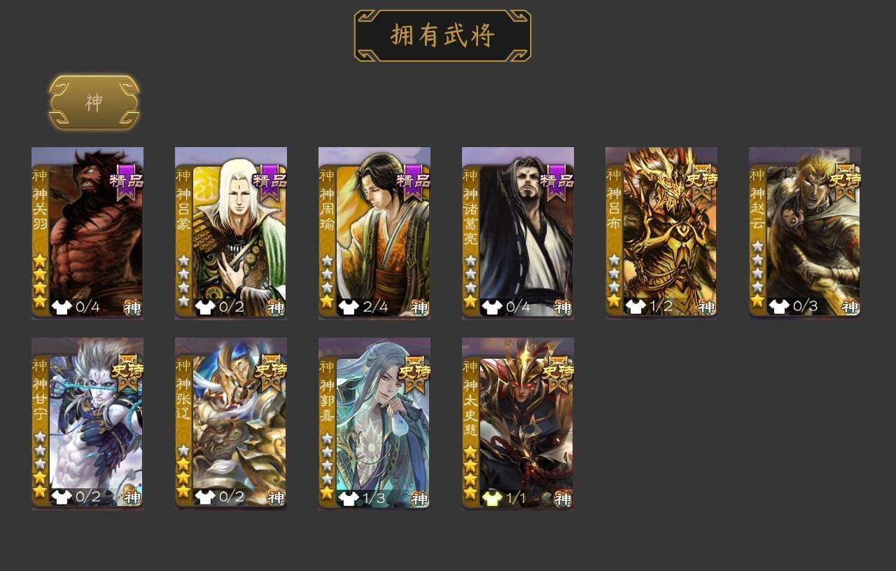 神吕布,神赵云,神甘宁,神张辽,神郭嘉,神太史慈,神关羽,神吕蒙,神周瑜,神诸葛亮,星周不疑,王粲,文鸯,王凌,魏-司马昭,界钟会,曹婴,曹纯,戏志才,谋诸葛亮,马云騄,谋夏侯氏,谋赵