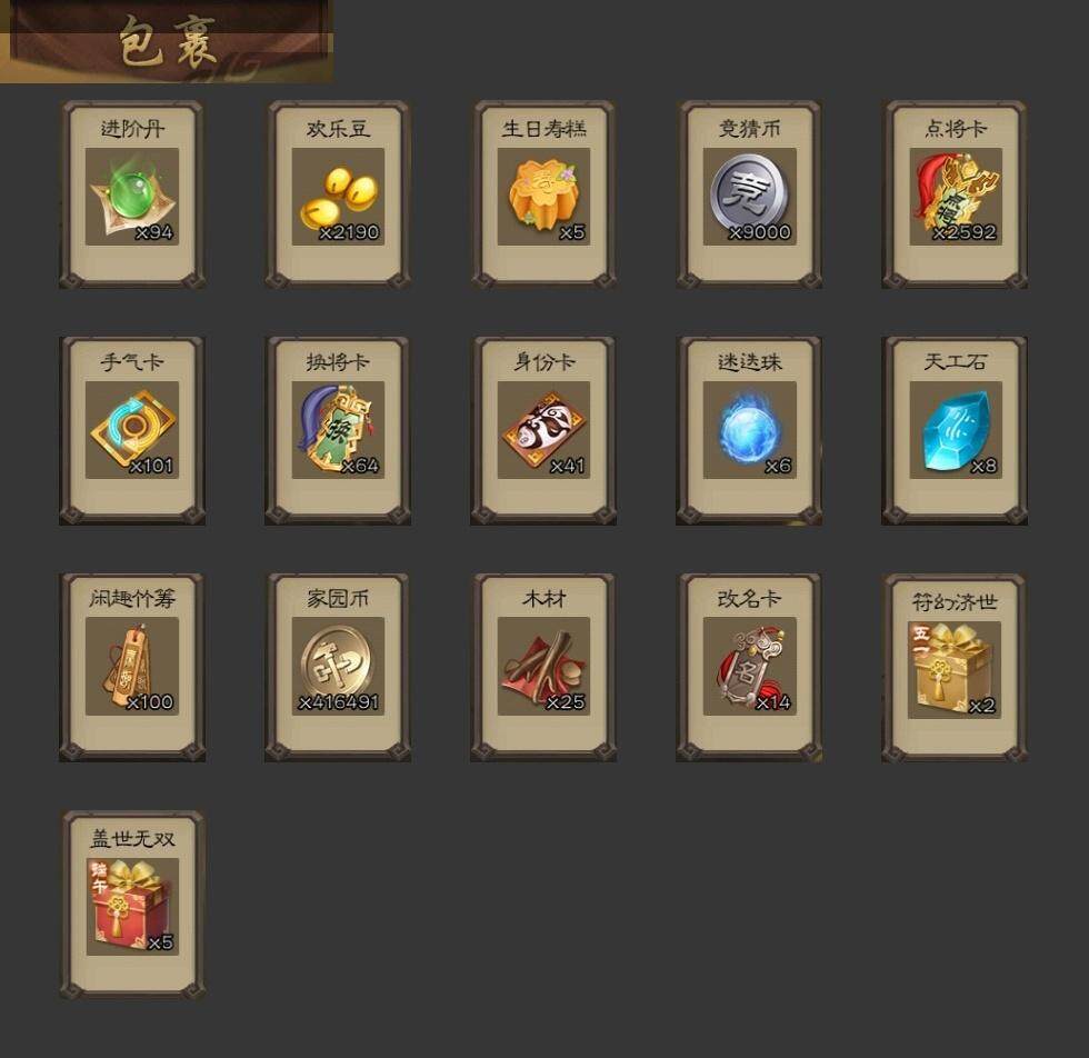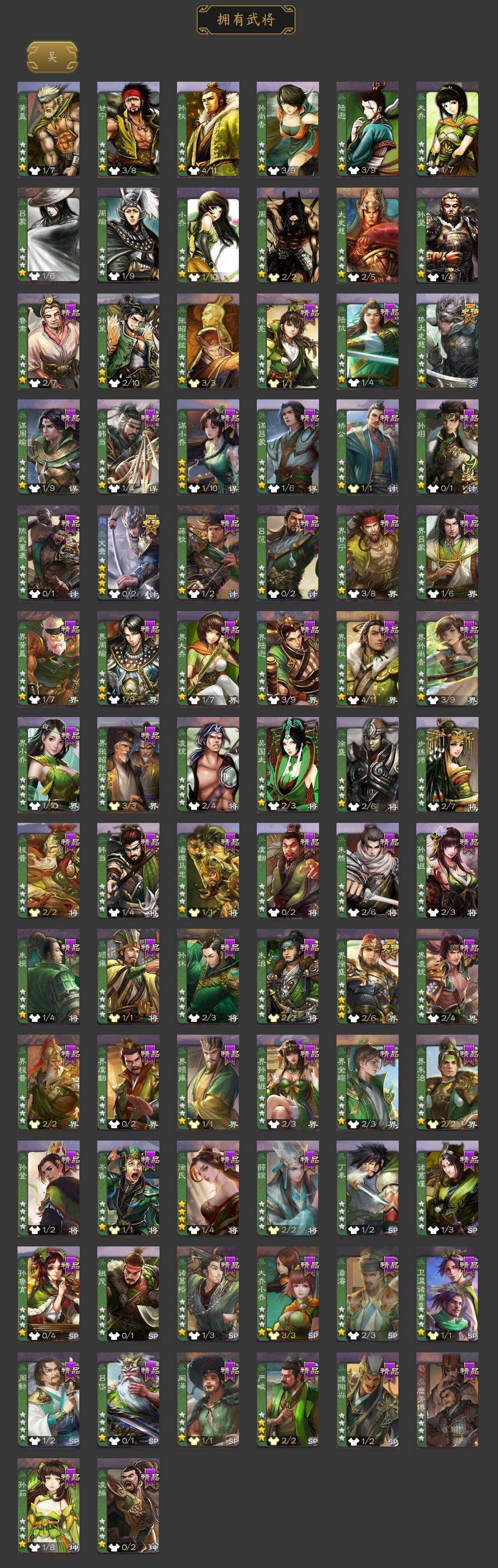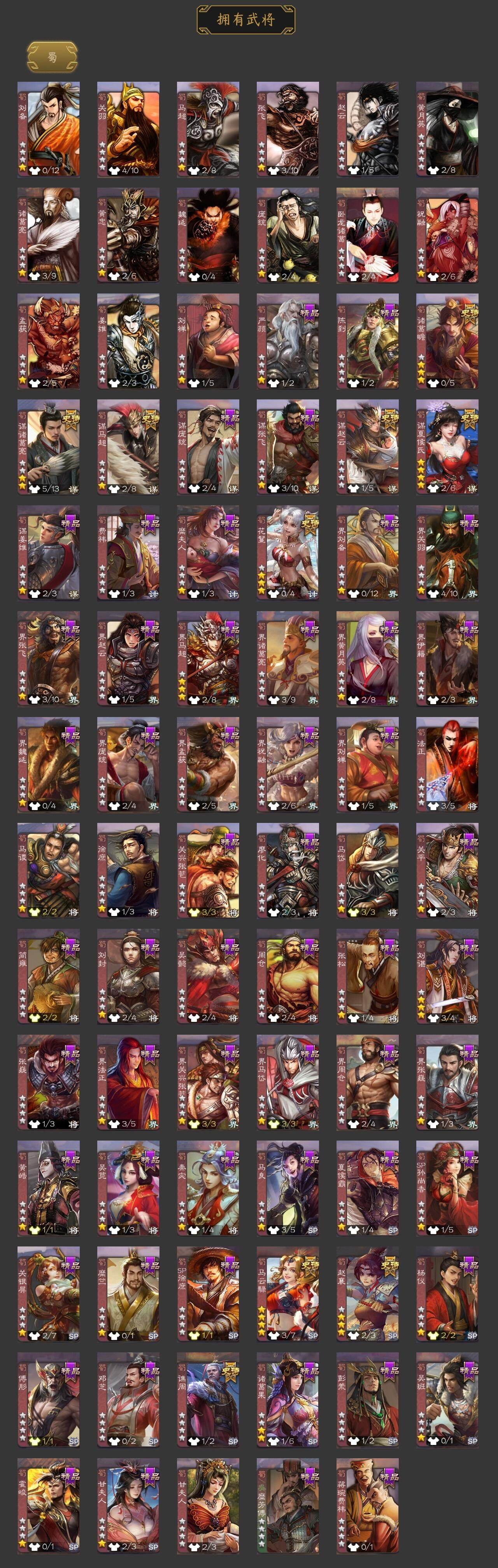 官阶:大将军;VIP等级:VIP10;史诗武将数量:35;动态皮肤数量:61;武将总数:350;史诗宝珠数量:0;将魂数量:0;神将:10;魏国史诗武将:22;蜀国史诗武将:9;吴国史诗武将:2;群史诗武将:10