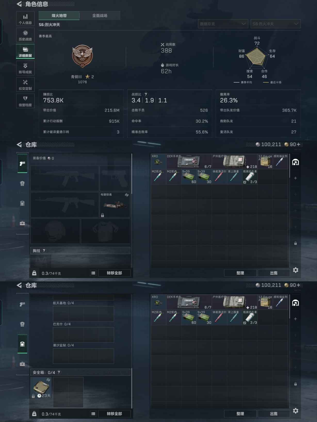 仓库价值3.8M-哈夫币100211-烽火地带等级49