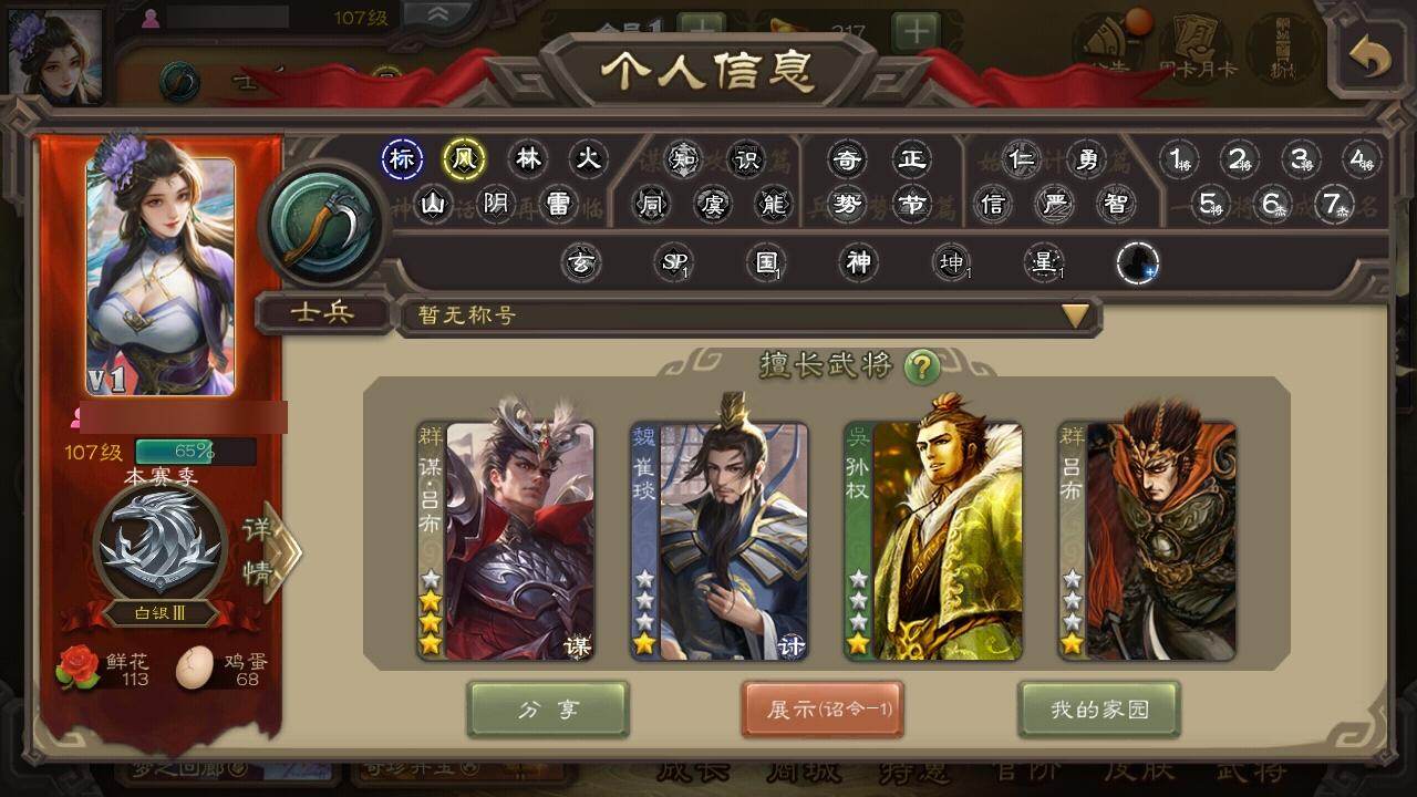 官阶:先锋将军;VIP等级:VIP1;史诗武将数量:2;动态皮肤数量:0;武将