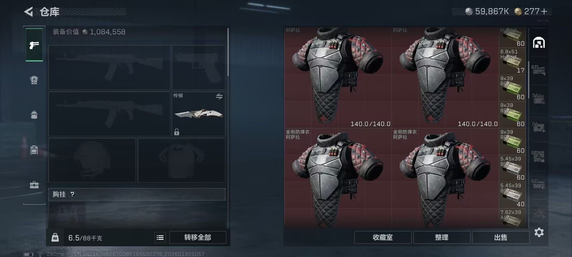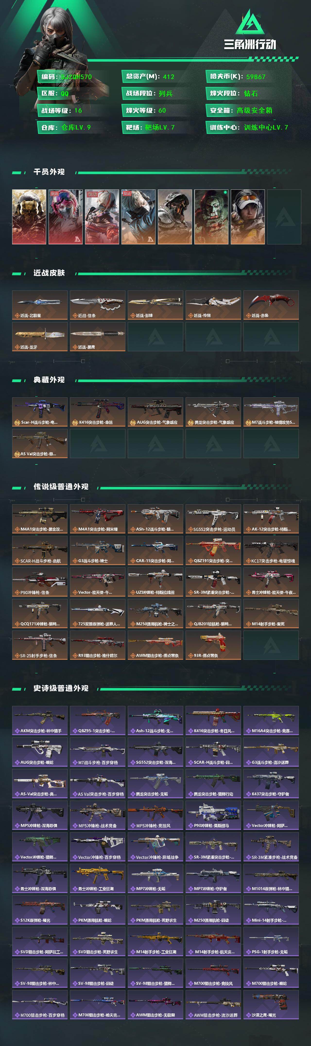 总资产(M):412M/哈夫币(K):59867K/传说枪皮数:30/全面战场等级:16_段位:列兵/烽火地带等级:60_段位:钻石/
