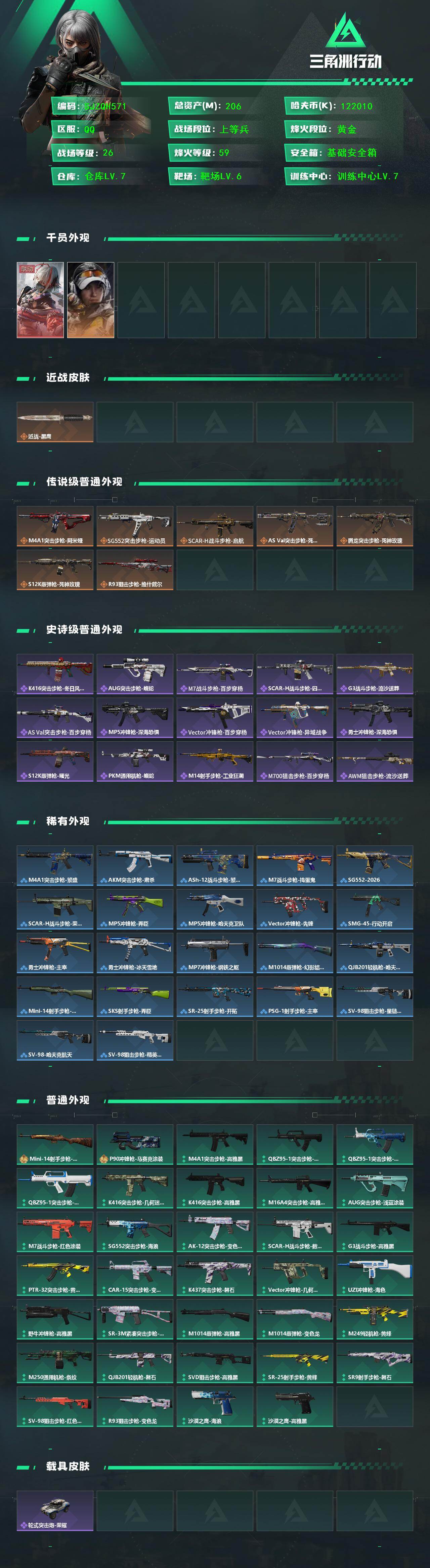 总资产(M):206M/哈夫币(K):122010K/传说枪皮数:7/全面战场等级:26_段位:上等兵/烽火地带等级:59_段位:黄金/