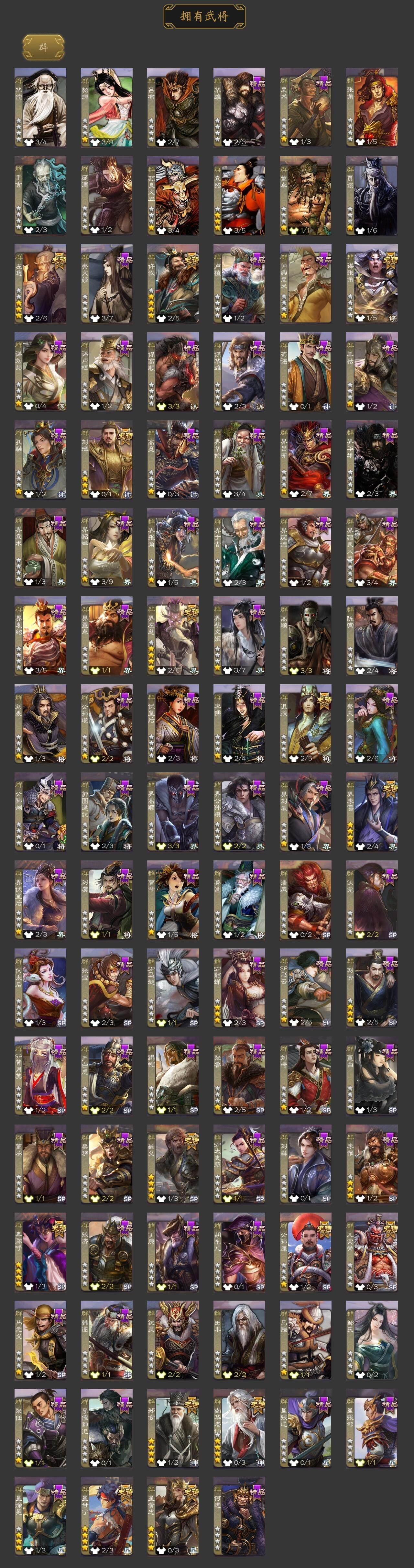 神赵云,神甘宁,神张辽,神孙策,神吕蒙,神周瑜,神诸葛亮,星周不疑,王粲,界钟会,界于禁,界曹真,郝昭,程昱,曹纯,戏志才,牛金,臧霸,蕫昭,张春华,界司马懿,王双,于禁,李典,界夏侯渊,曹真,韩浩史涣,孙资刘放,徐晃,界徐晃,诸葛诞,界夏侯惇,曹彰,文聘,钟会,界张辽,界曹操,司马朗,曹植,郭皇后,郭淮,辛宪英,乐进,李通,袁涣,界曹休,界典韦,界邓艾,陈群,华歆,界郭淮,界许褚,界王异,界陈