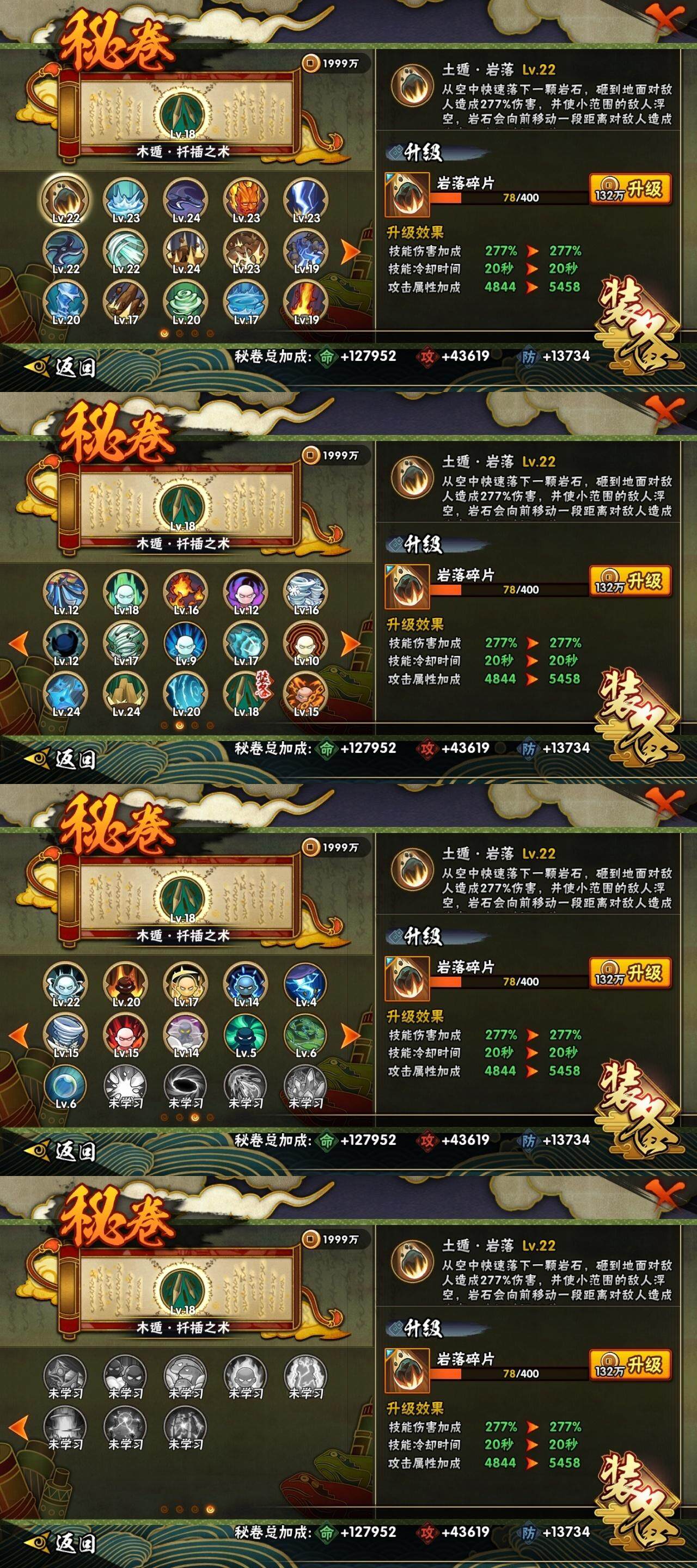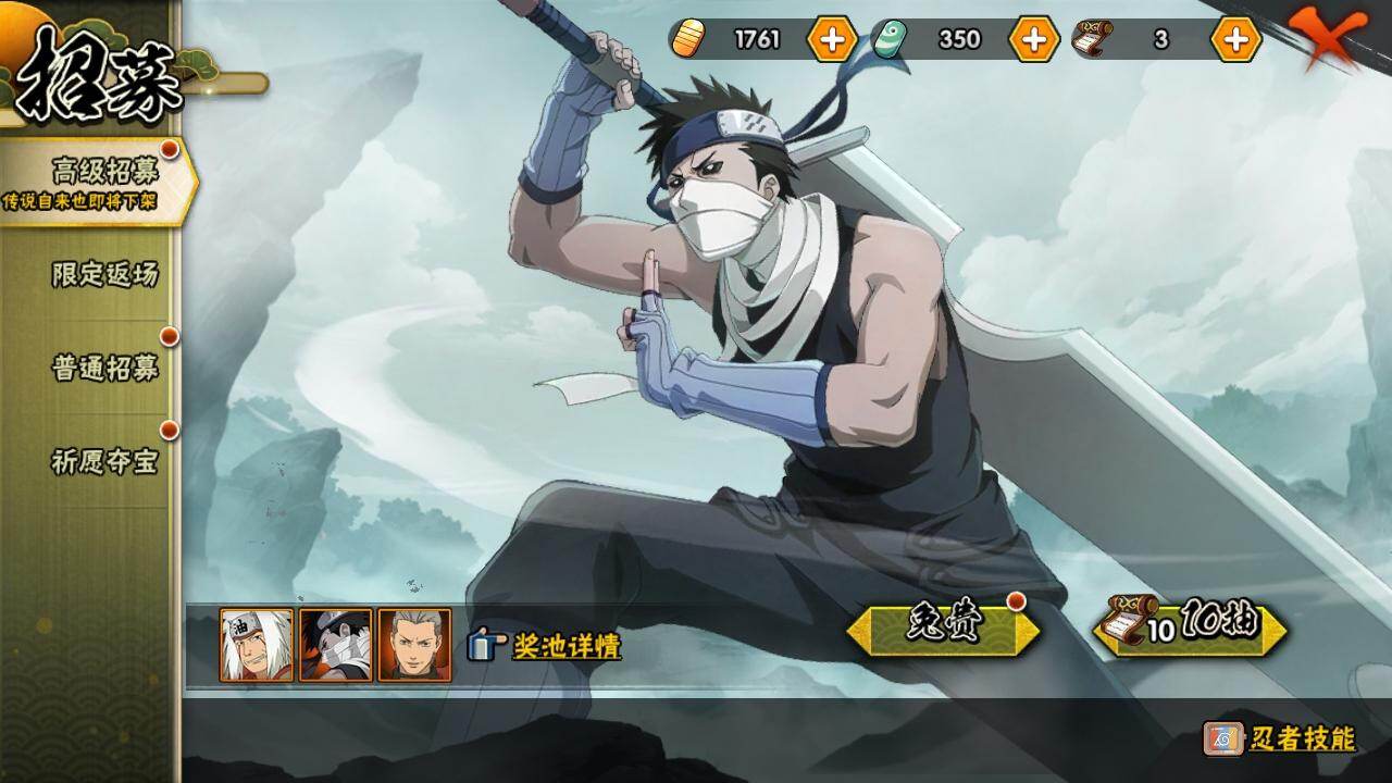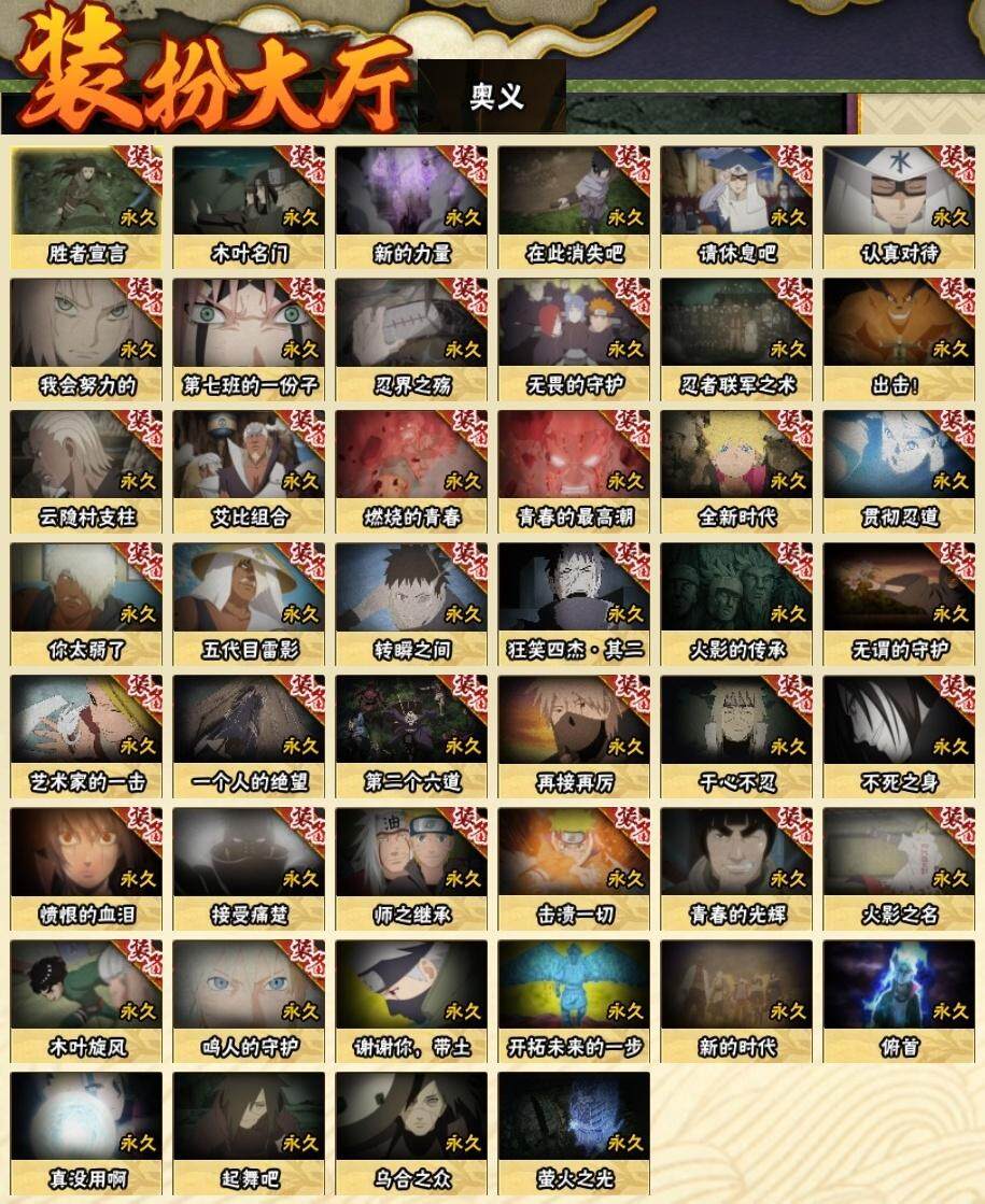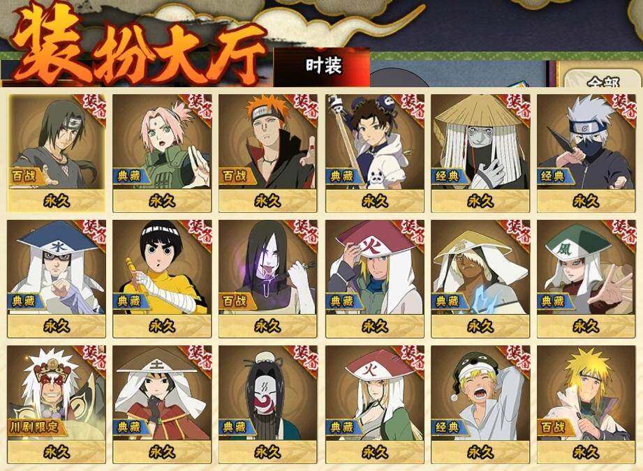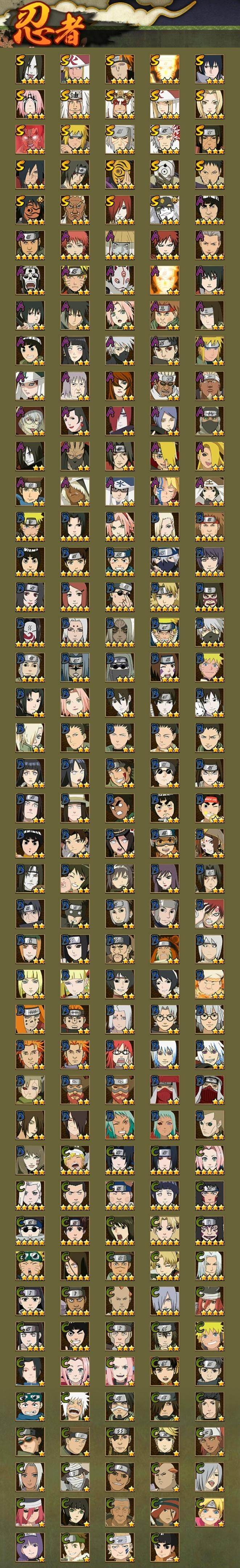 3星大筒木桃式,3星宇智波佐助「永恒万花筒」,3星宇智波斑「秽土转生·解」,3星神秘面具男「红夜之刃」,3星宇智波带土「忍界大战」,3星宇智波斑「白面具」,4星波风水门,3星漩涡鸣人「九喇嘛连结」,3星迈特凯「死门」,3星千手扉间「秽土转生」,3星宇智波鼬「须佐能乎」,3星神秘面具男,3星千手柱间「秽土转生」,3星千手扉间,3星波风水门「秽土转生」,3星
