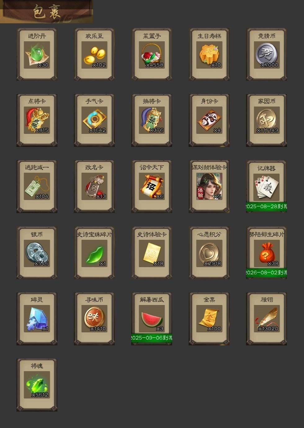 官阶:中军将军;VIP等级:VIP6;史诗武将数量:6;动态皮肤数量:3;武将