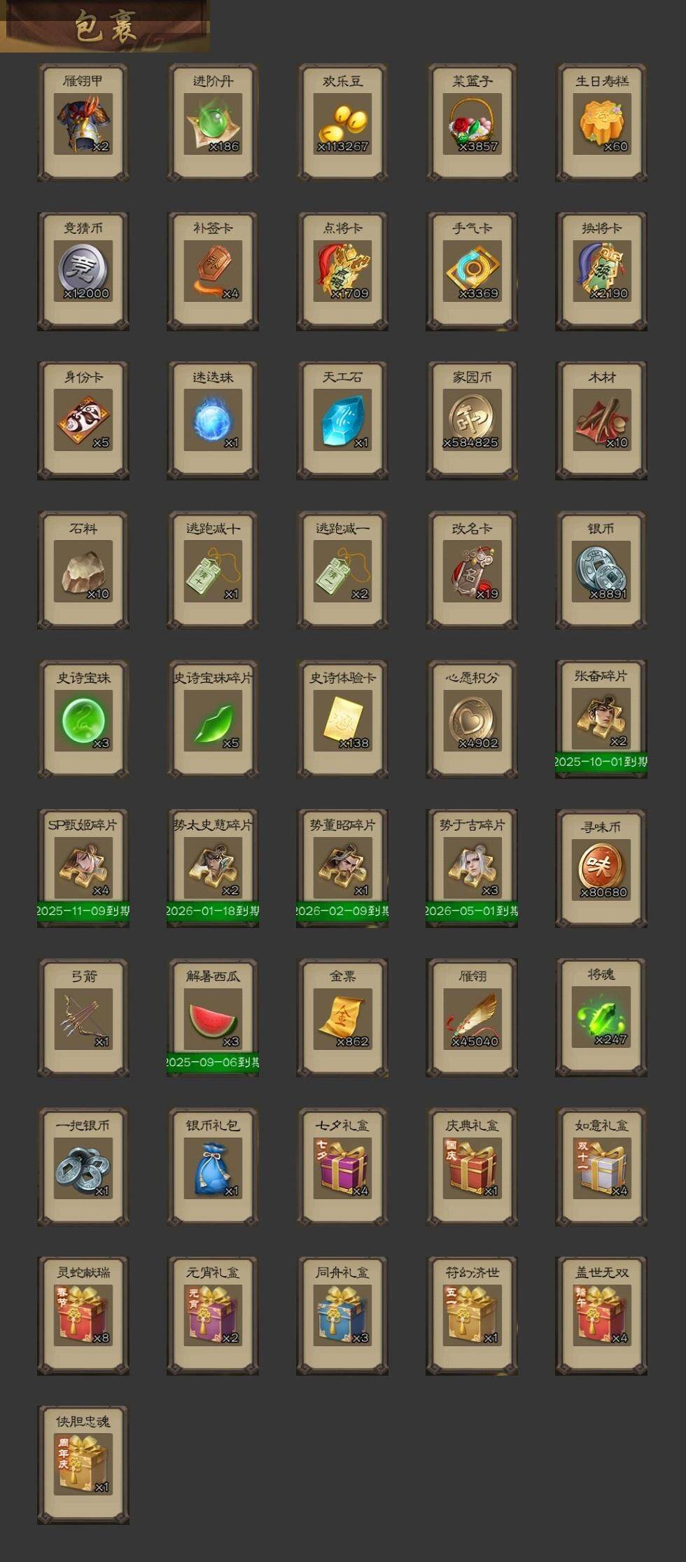 官阶:骠骑将军;VIP等级:VIP8;史诗武将数量:27;动态皮肤数量:22;武将总数:280;史诗宝珠数量:3;将魂数量:0;神将:5;魏国史诗武将:4;蜀国史诗武将:6;吴国史诗武将:2;群史诗武将:10
