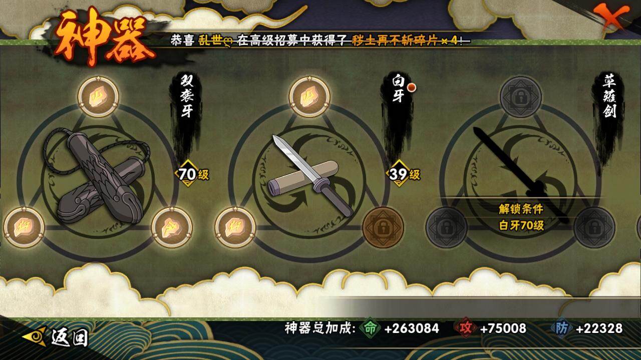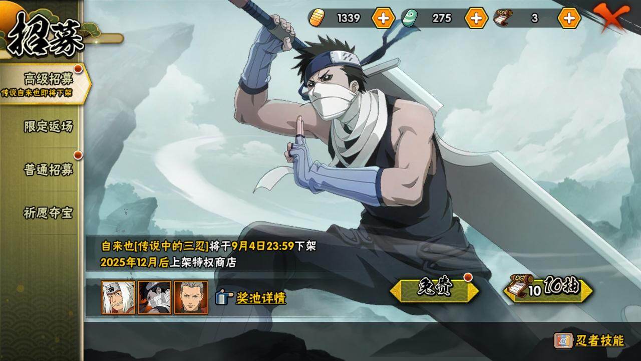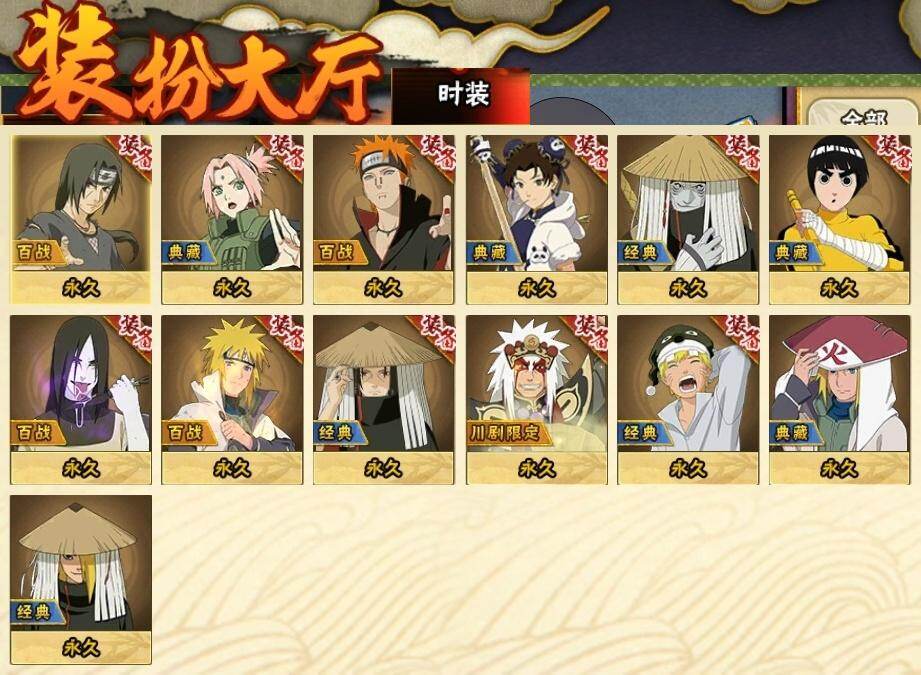3星宇智波佐助「永恒万花筒」,3星宇智波带土「忍界大战」,3星宇智波斑「白面具」,3星波风水门,3星漩涡鸣人「九喇嘛连结」,3星迈特凯「死门」,3星千手扉间「秽土转生」,3星宇智波鼬「秽土转生」,3星宇智波鼬「须佐能乎」,3星波风水门「秽土转生」,3星宇智波斑,3星药师兜「仙人模式」,3星长门「秽土转生」,4星佩恩「天道」,3星艾「四代目雷影」,3星春野
