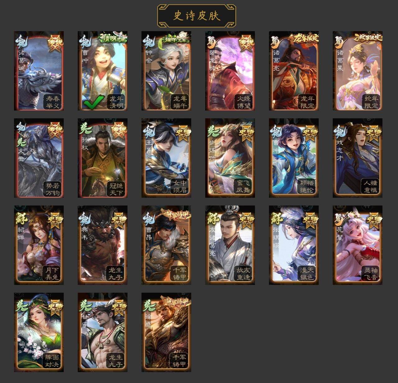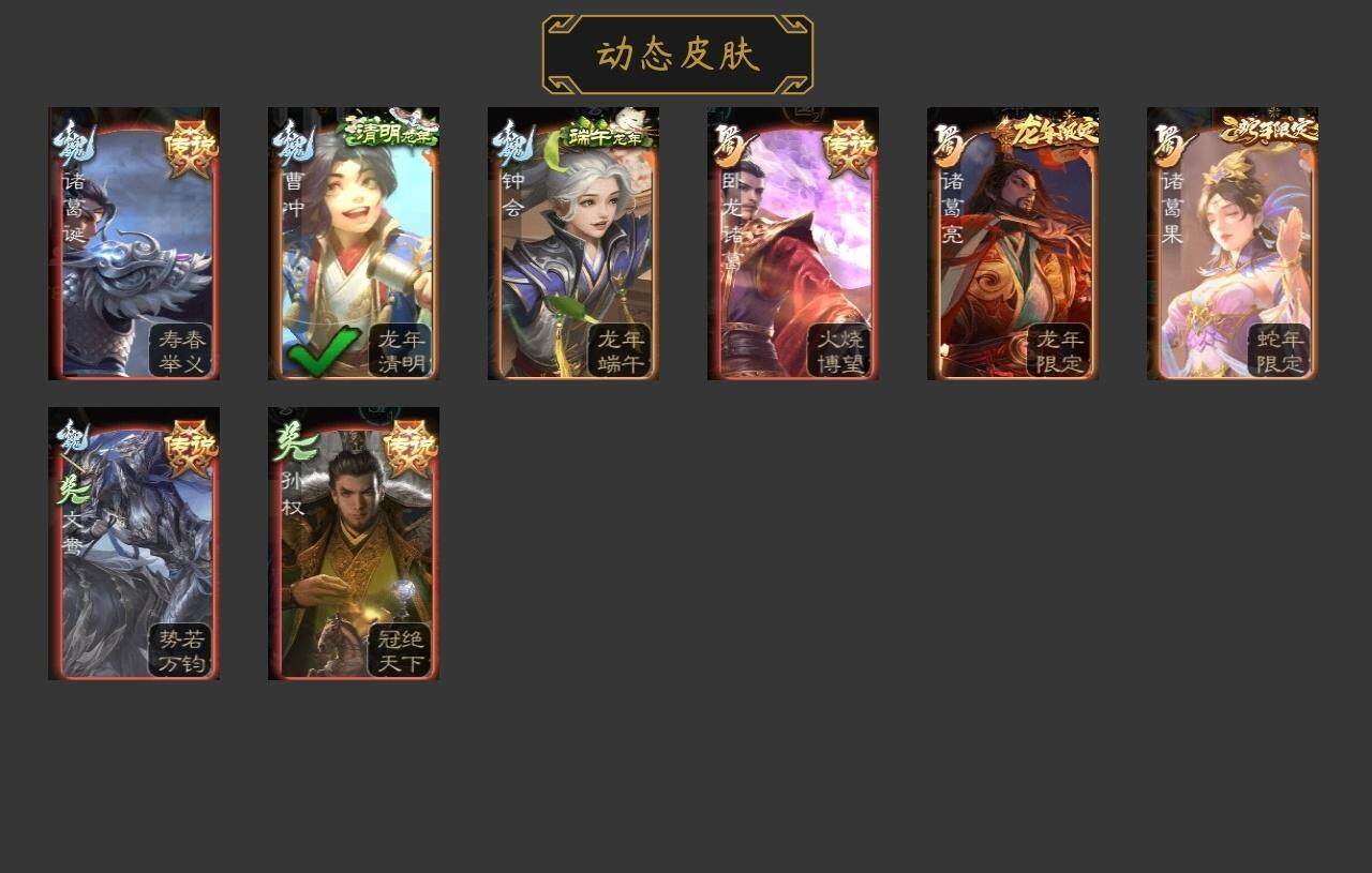 神吕蒙,神周瑜,界钟会,曹纯,谋赵云,花鬘,界徐盛,谋郭嘉,张让,界左慈,钟会-龙年端午(动态),诸葛诞-寿春举义(动态),诸葛亮-龙年限定(动态),诸葛果-蛇年限定(动态),卧龙诸葛-火烧博