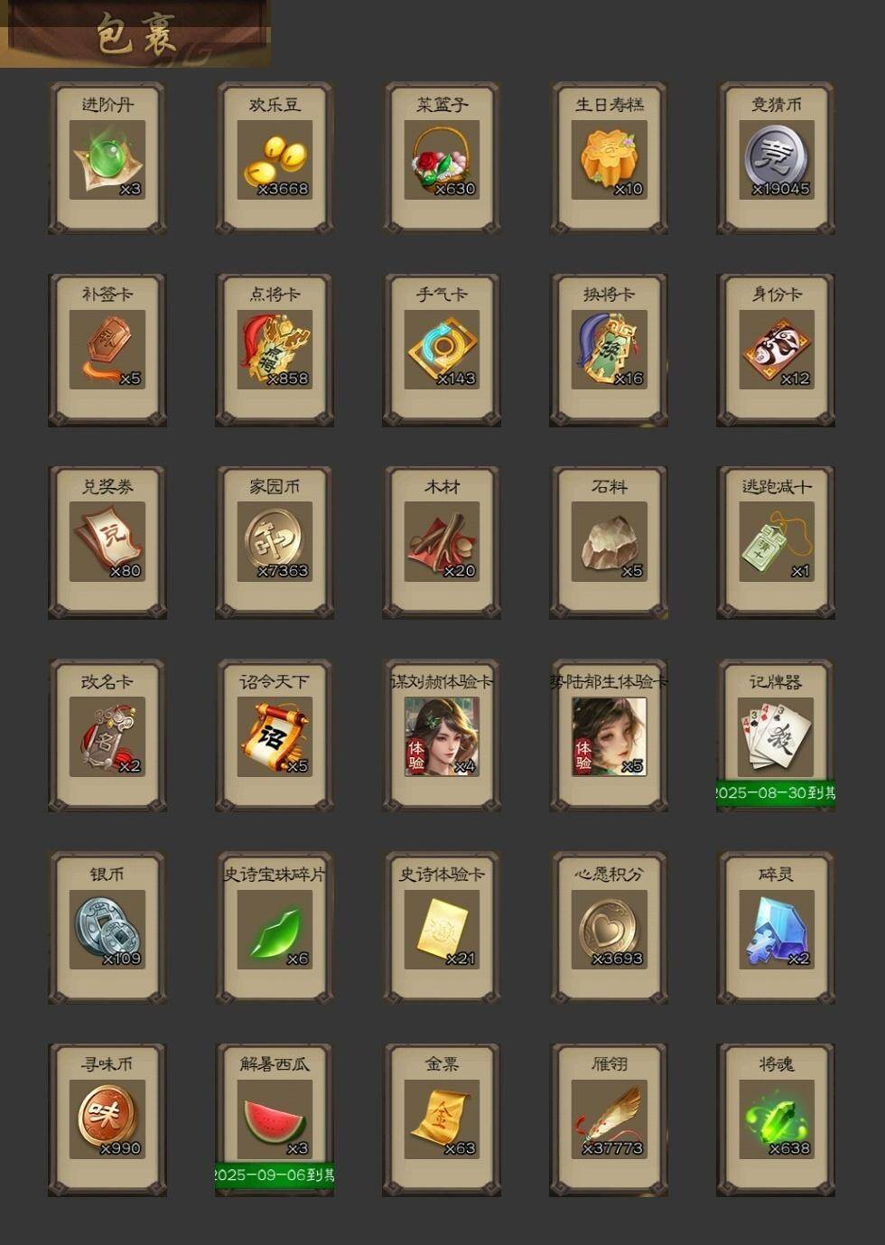 官阶:领军将军;VIP等级:VIP1;史诗武将数量:0;动态皮肤数量:11;武将总数:250;史诗宝珠数量:0;将魂数量:0;神将:2;魏国史诗武将:4;蜀国史诗武将:2;吴国史诗武将:1;群史诗武将:3