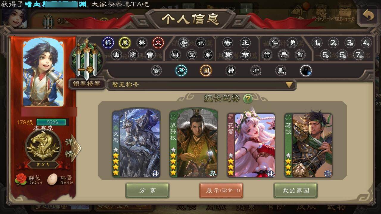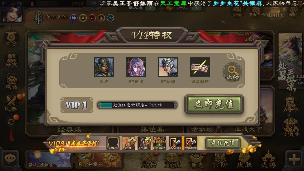 官阶:领军将军;VIP等级:VIP1;史诗武将数量:0;动态皮肤数量:11;武