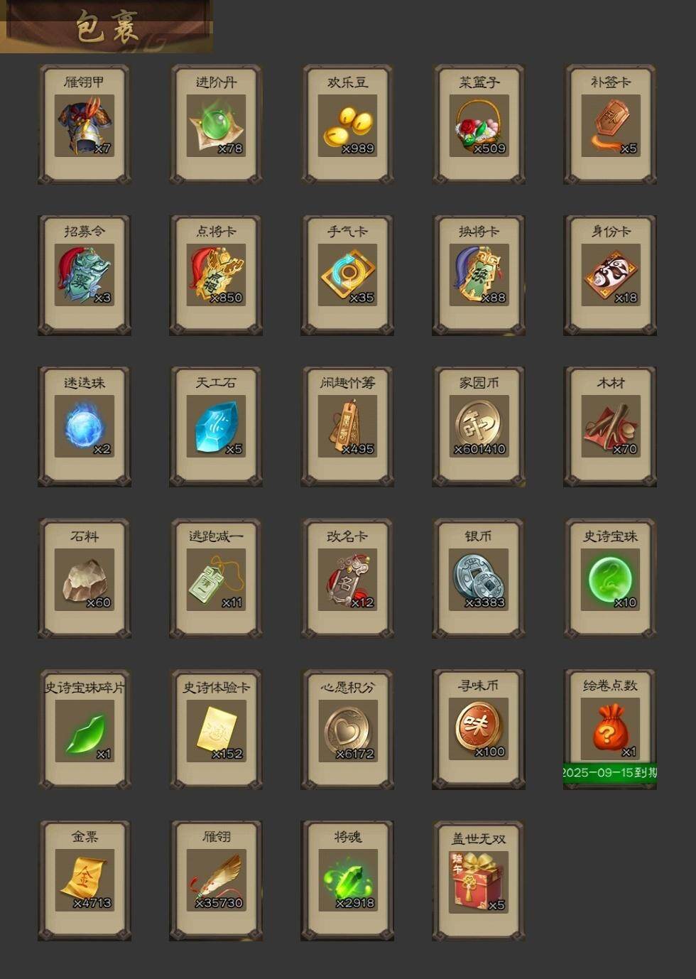 官阶:骠骑将军;VIP等级:VIP8;史诗武将数量:23;动态皮肤数量:22;