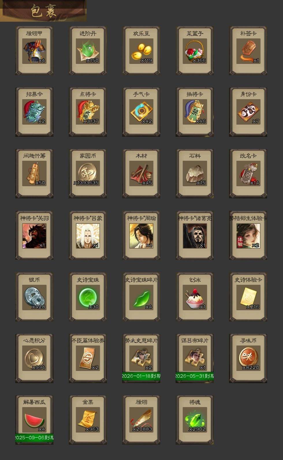 官阶:大将军;VIP等级:VIP9;史诗武将数量:38;动态皮肤数量:50;武将总数:363;史诗宝珠数量:30;将魂数量:2900;神将:6;魏国史诗武将:10;蜀国史诗武将:6;吴国史诗武将:5;群史诗武将:15