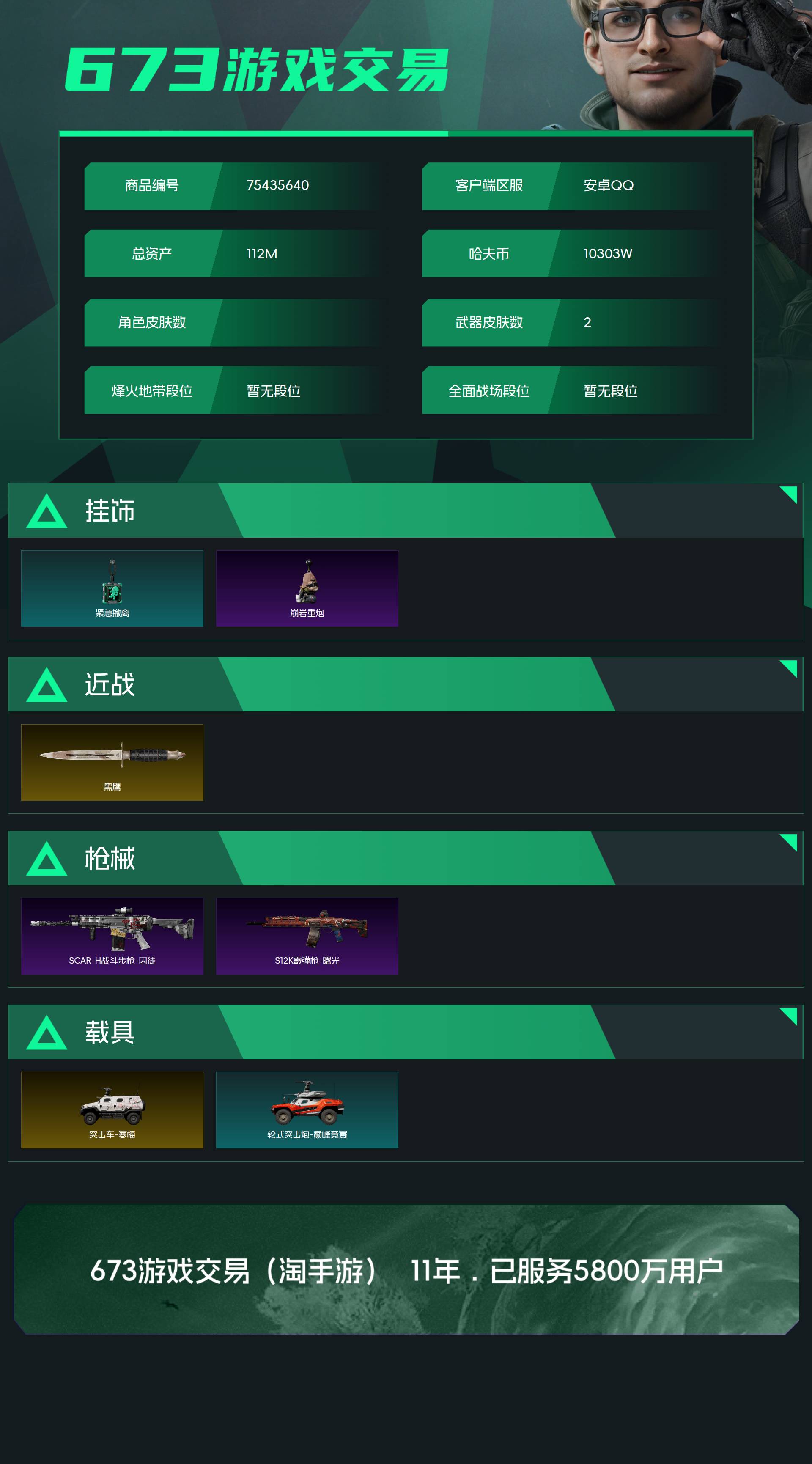 烽火段位暂无段位 战场段位暂无段位 总资产112M 哈夫币10303W 挂饰2 近战1 枪械2 载具2