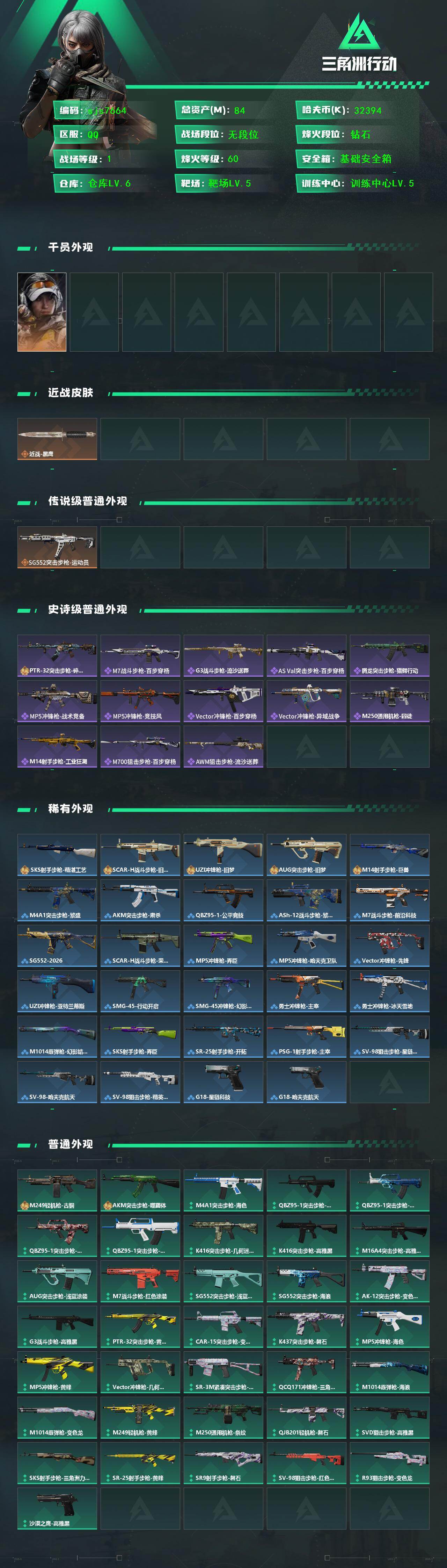 【sjs7664】高特勤性价比小号 烽火地带段位: 钻石 全面战场段位: 无段位 总资产: 84000000 哈夫币: 32394000 sjs7664 干员外观: 露娜-金牌射手(S7) 传说武器皮肤: SG552突击步枪-运动员 史诗武器皮肤: M250通用机枪-囚徒,腾龙突击步枪-猎鳄行动,MP5冲锋枪-战术竞备,PTR-32突击步枪-碎冰行动(典藏),G3战斗步枪-流沙送葬,AWM狙击步枪-流沙送葬,AS Val突击步枪-百步穿杨,M700狙击步枪-百步穿杨,Vector冲锋枪-百步穿杨