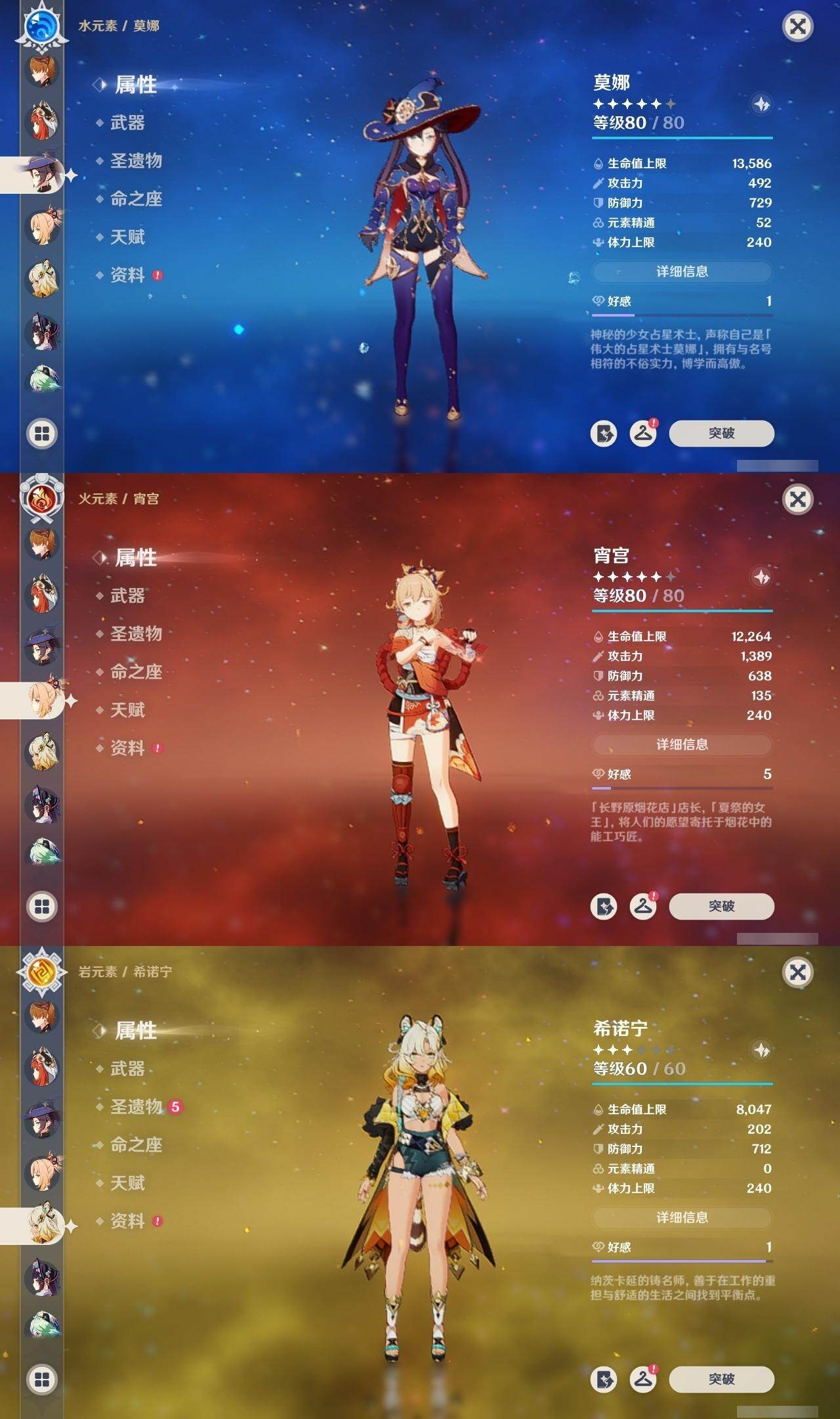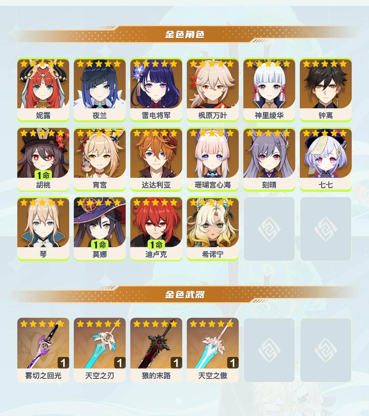 0命妮露,0命夜兰,0命雷电将军,0命枫原万叶,0命神里绫华,0命钟离,1命胡桃,0命宵宫,0命达达利亚,0命珊瑚宫心海,0命刻晴,0命七七,0命琴,1命莫娜,1命迪卢克,0命希诺宁,精1雾切之回光,精1天空之刃,精1狼的末路,精1天空之傲