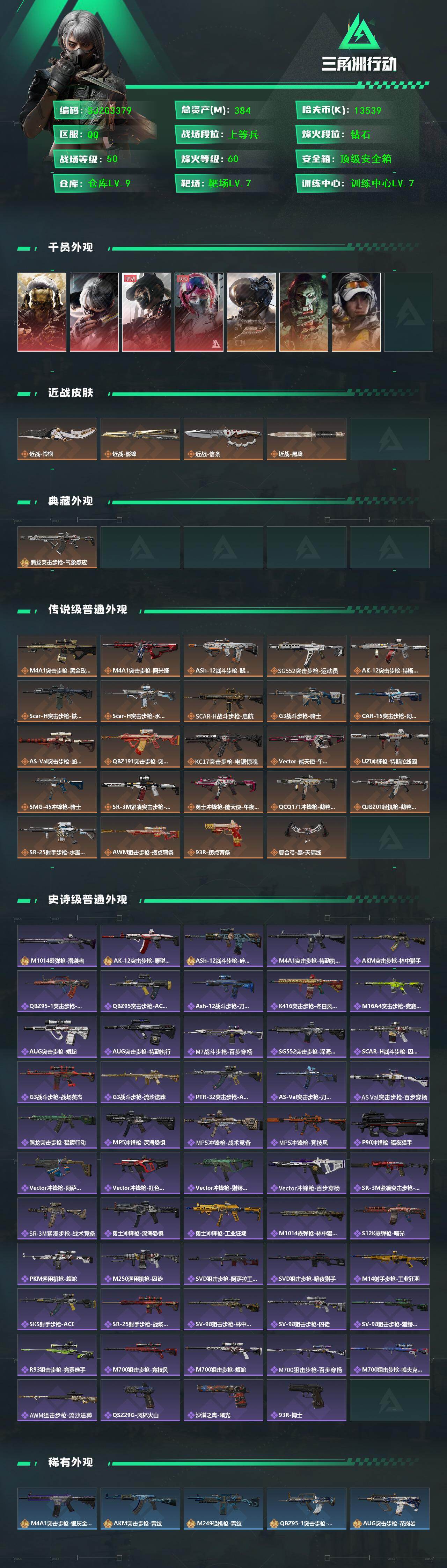 总资产(M):384M/哈夫币(K):13539K/传说枪皮数:25/全面战场等级:50_段位:上等兵/烽火地带等级:60_段位:钻石/
