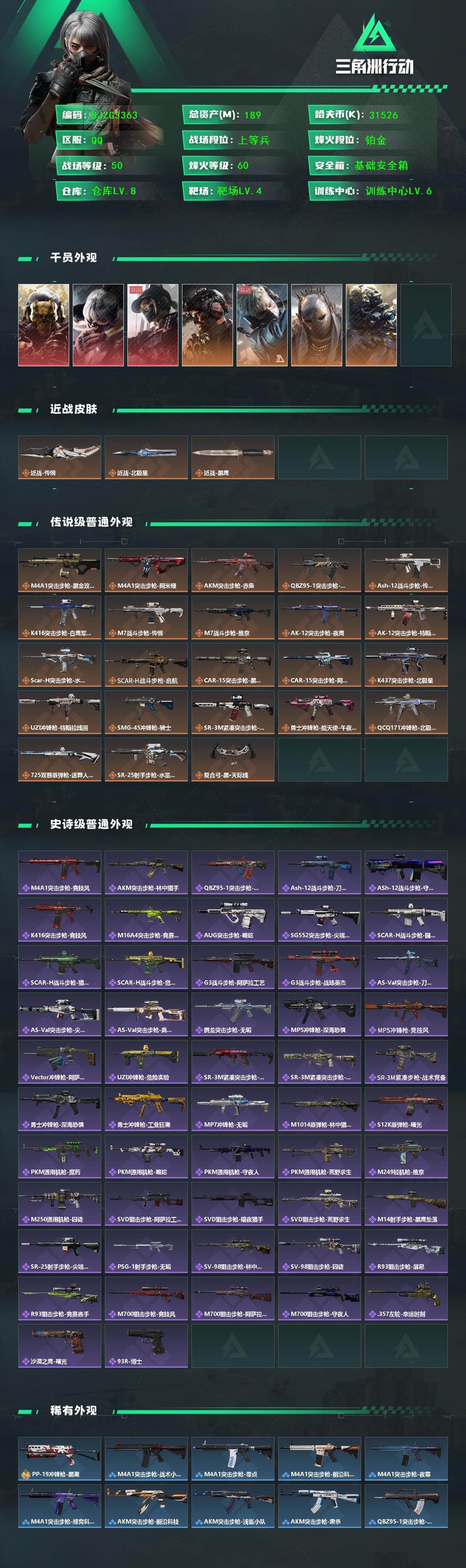 【SJZG3363】总资产(M):189M/哈夫币(K):31526K/哈夫币(K):31526K/传说枪皮数:23/全面战场等级:50_段位:上等兵/烽火地带等级:60_段位:铂金/红狼-蚀金玫瑰/骇爪-水墨云图/露娜-黑·天际线/威龙-铁面判官/蜂医-送葬人·无题密令/牧羊人-街头之王/无名-夜鹰/近战-北极星/近战-怜悯/近战-黑鹰/M4A1突击步枪-蚀金玫瑰/M4A1突击步枪-阿米娅/AKM突击步枪-赤枭/QBZ95-1突击步枪-破军/ASh-12战斗步枪-怜悯/K416突击步枪-白鹰军