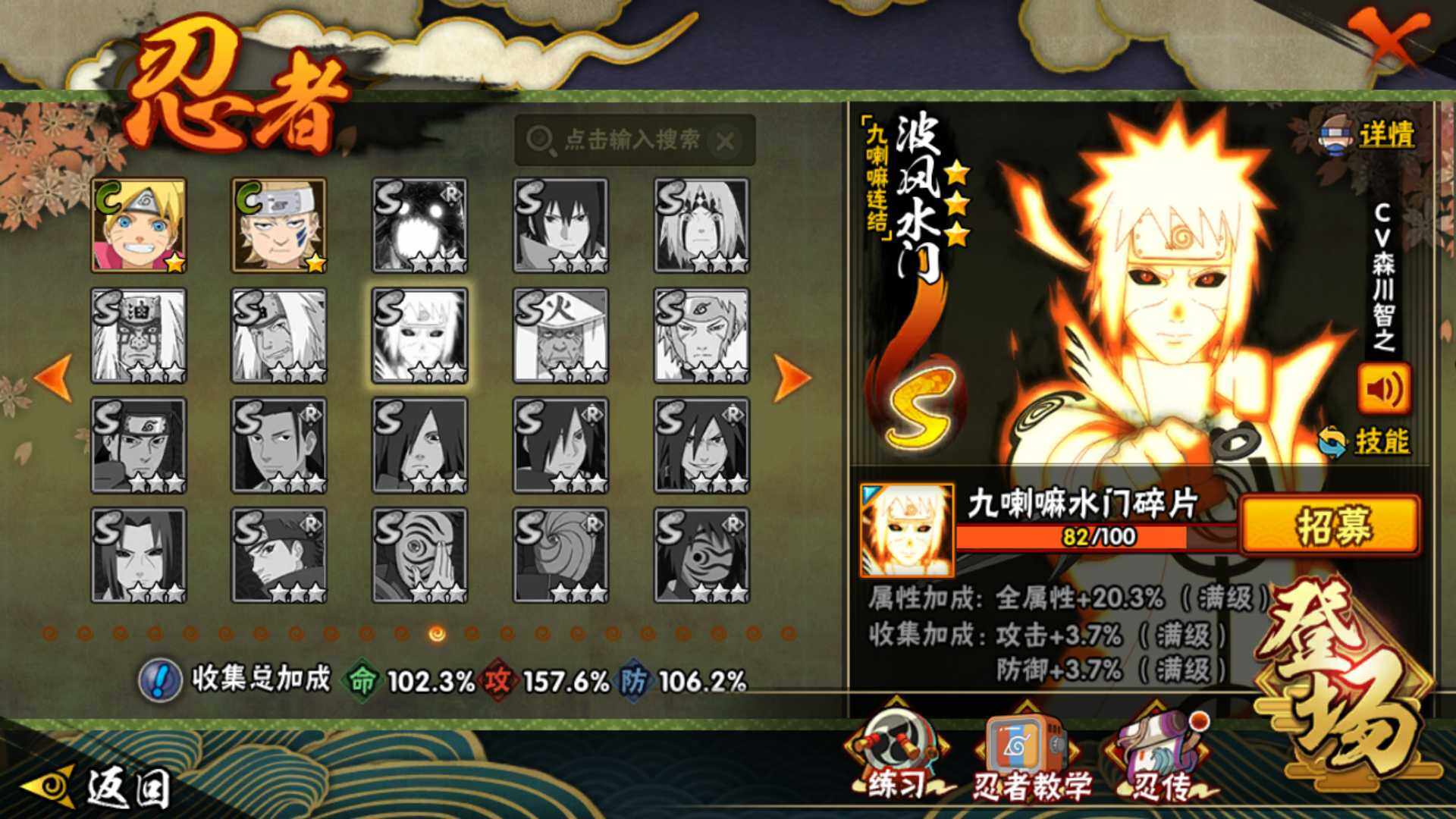 【S级忍者】:猿飞日斩「秽土转生」(3星),波风水门「秽土转生」(3星),千手扉间「秽土转生」(3星),千手柱间「秽土转生」(3星),宇智波斑「秽土转生」(3星),宇智波斑「秽土转生·解」(3星),宇智波带土「忍界大战」(3星),宇智波鼬「须佐能乎」(3星),旗木卡卡西「须