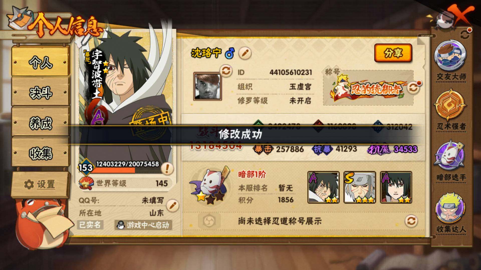 v8 1318万战力 23S 48A 1.9W金币 九水门82片 十尾59片 传说自来也70片 忍战艾63片 zp3438
