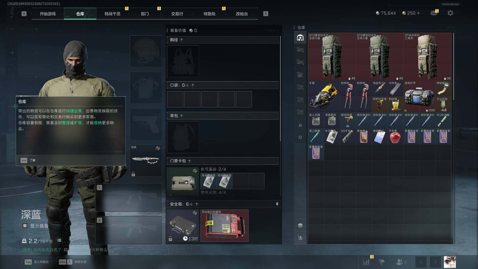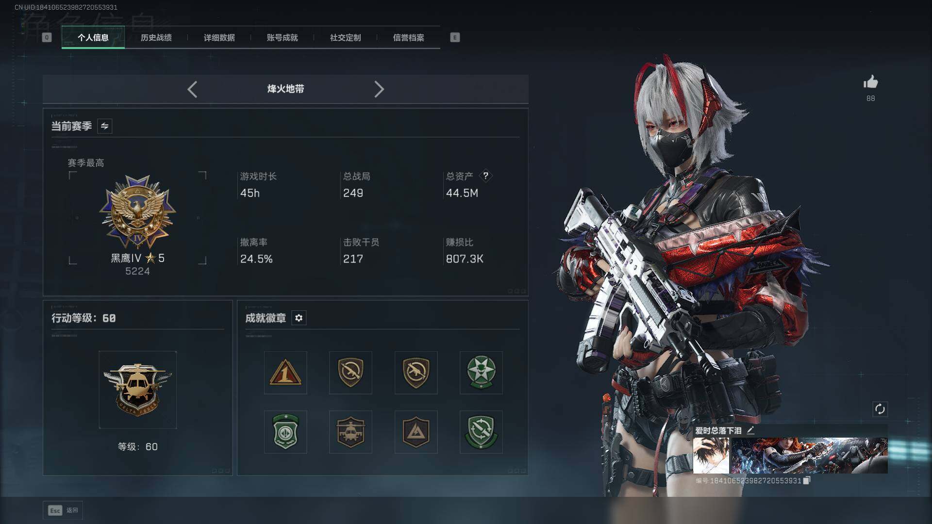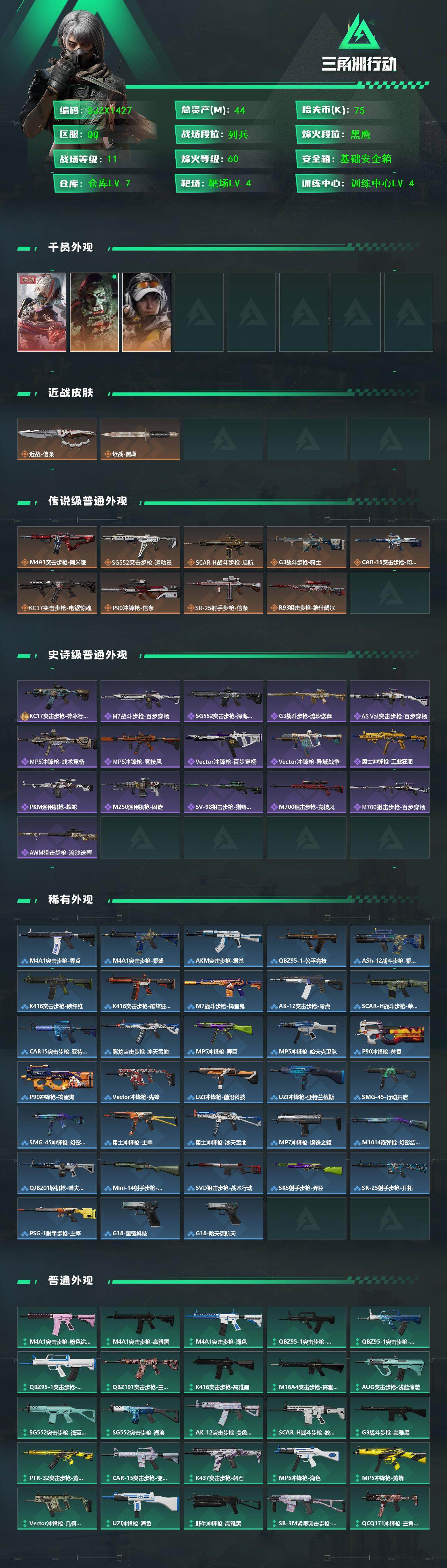 总资产(M):44M/哈夫币(K):75K/传说枪皮数:9/全面战场等级:11_段位:列兵/烽火地带等级:60_段位:黑鹰/