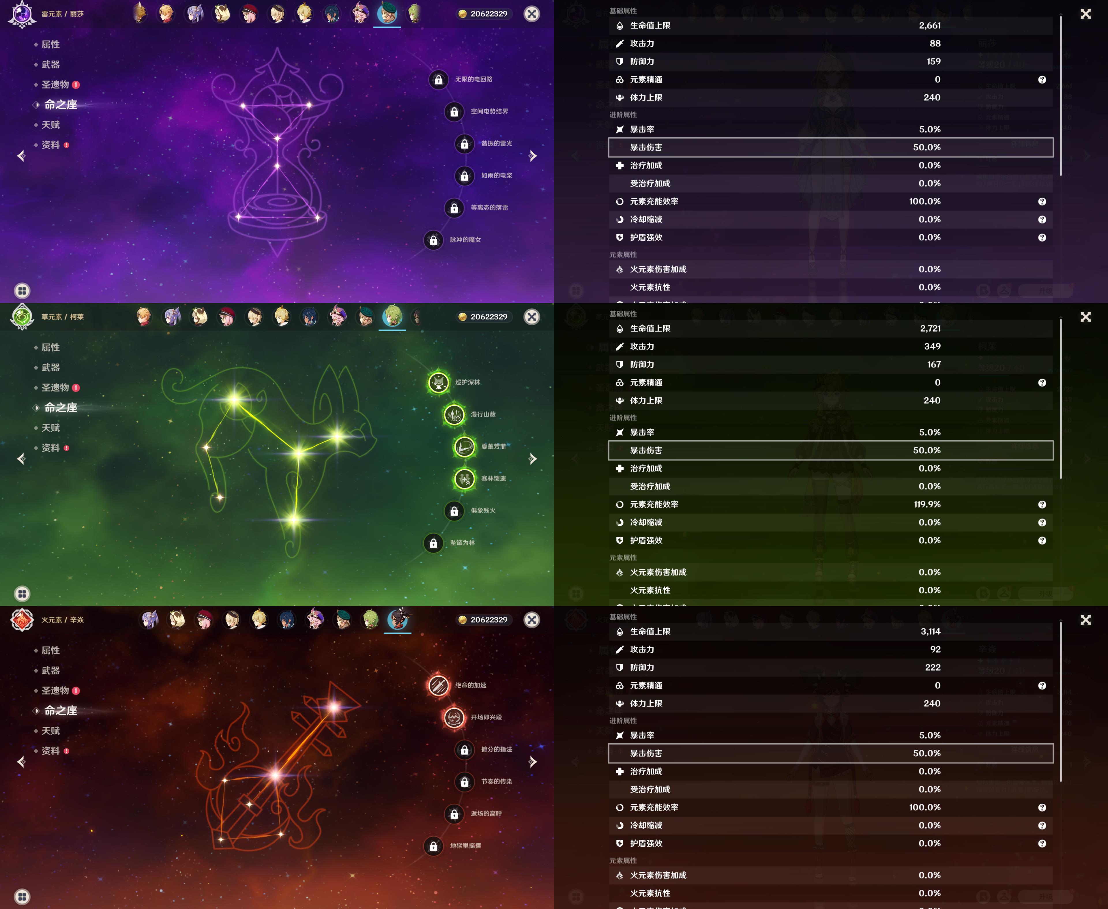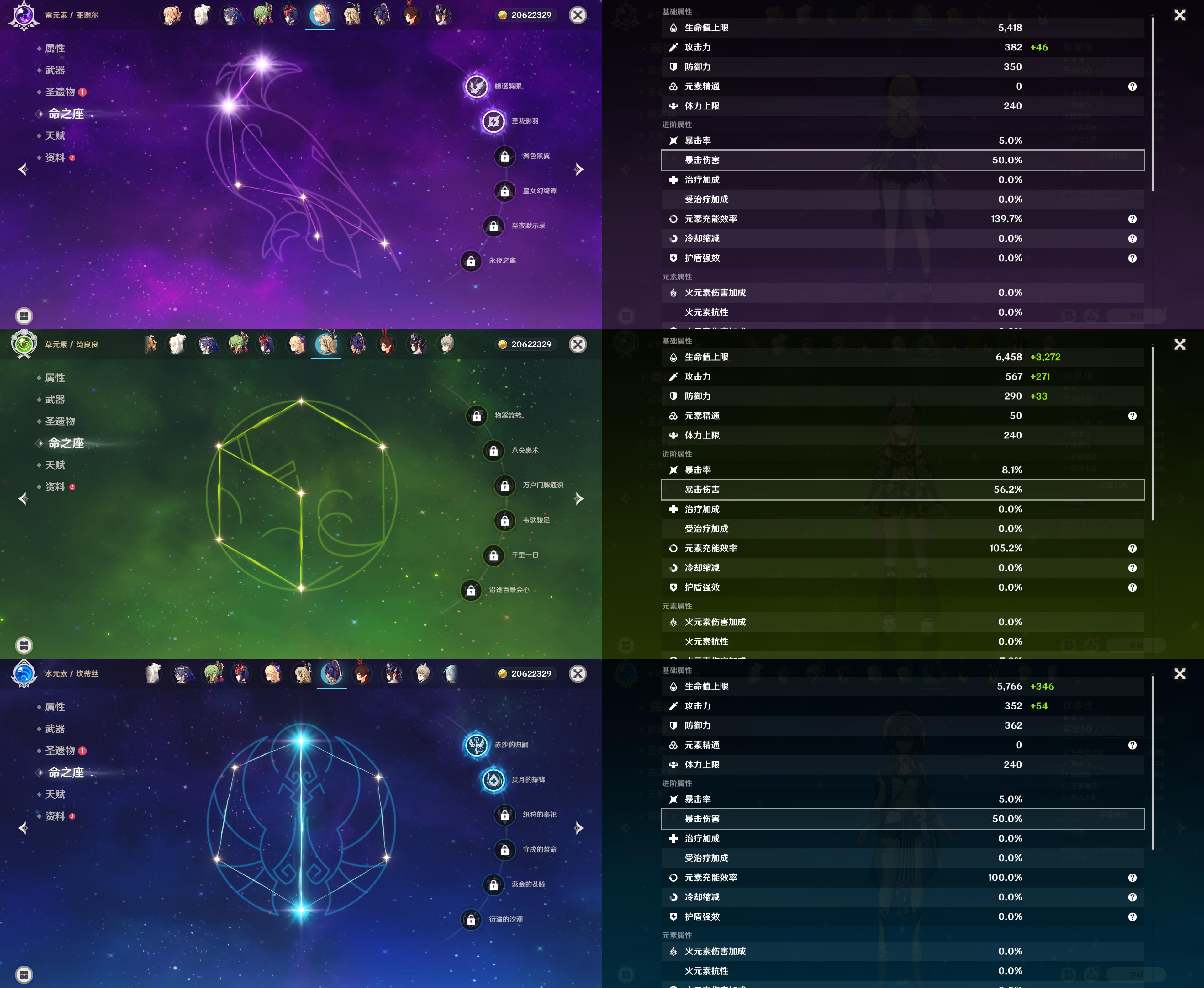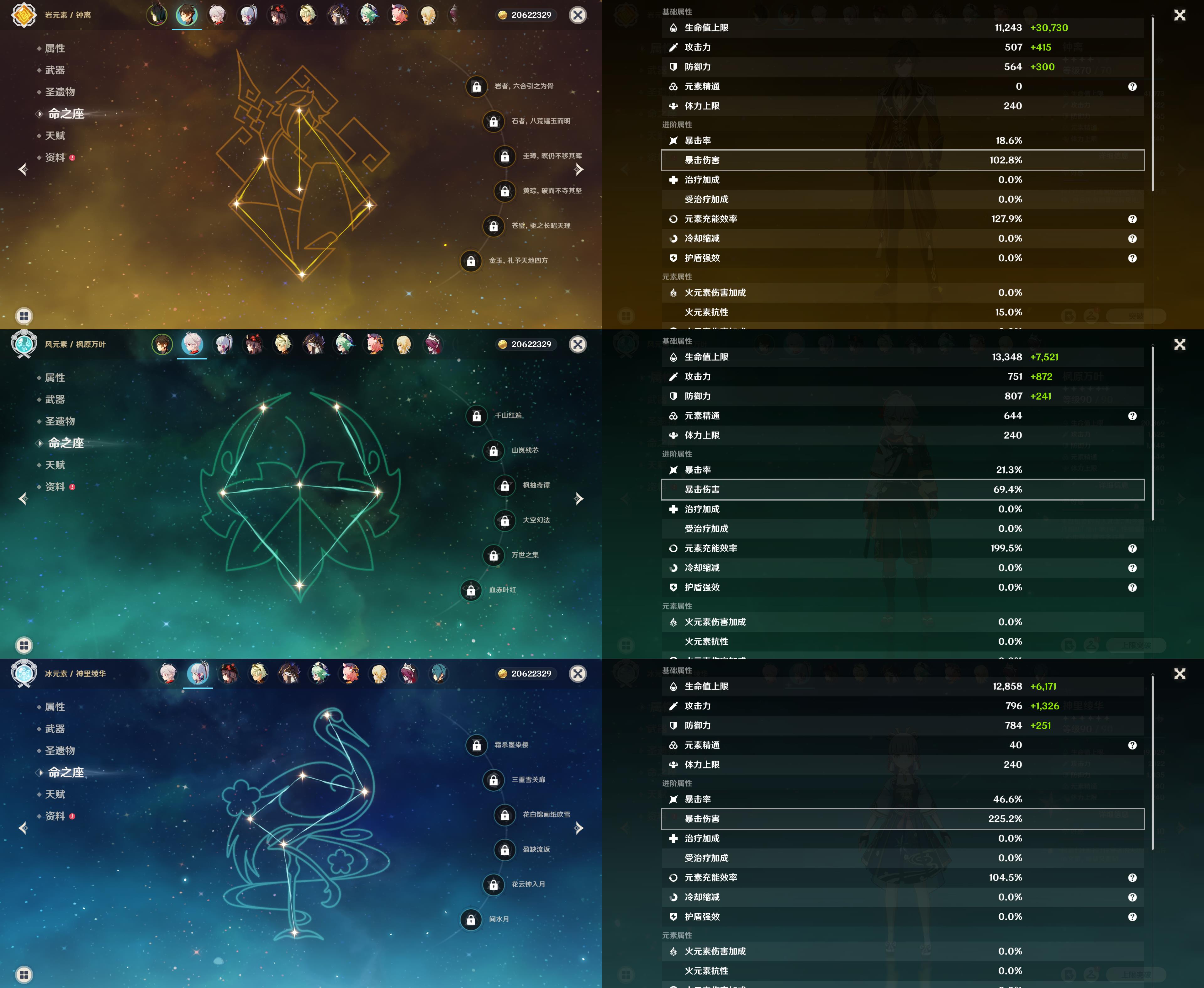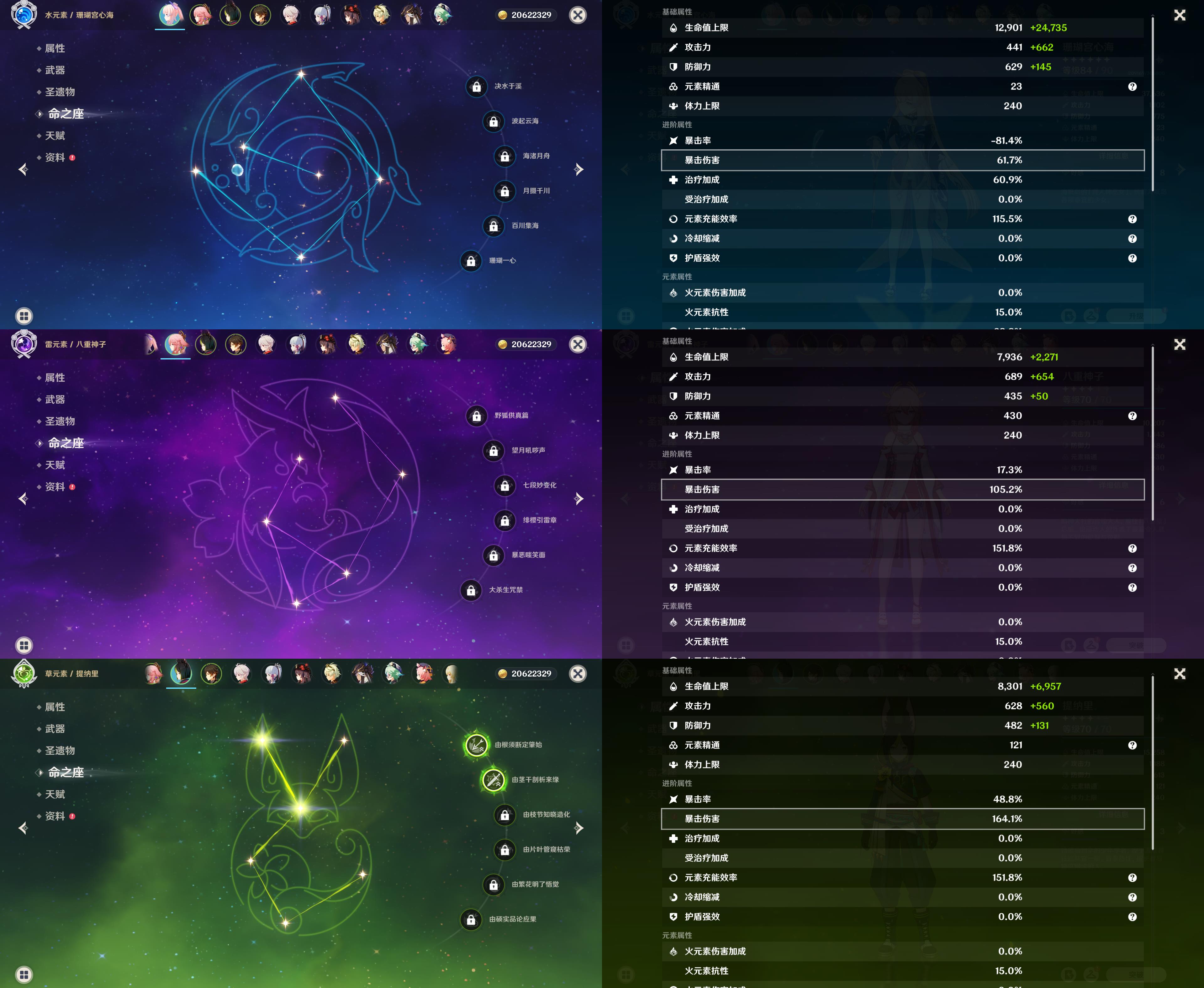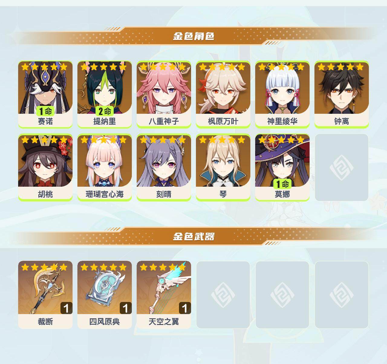 57级/18黄/女主/11个五星角色/3个五星武器/珊瑚宫心海/八重神子/2命提纳里/钟离/枫原万叶/神里绫华/胡桃/1命赛诺/1命莫娜/琴/刻晴/四风原典/天空之翼/裁断