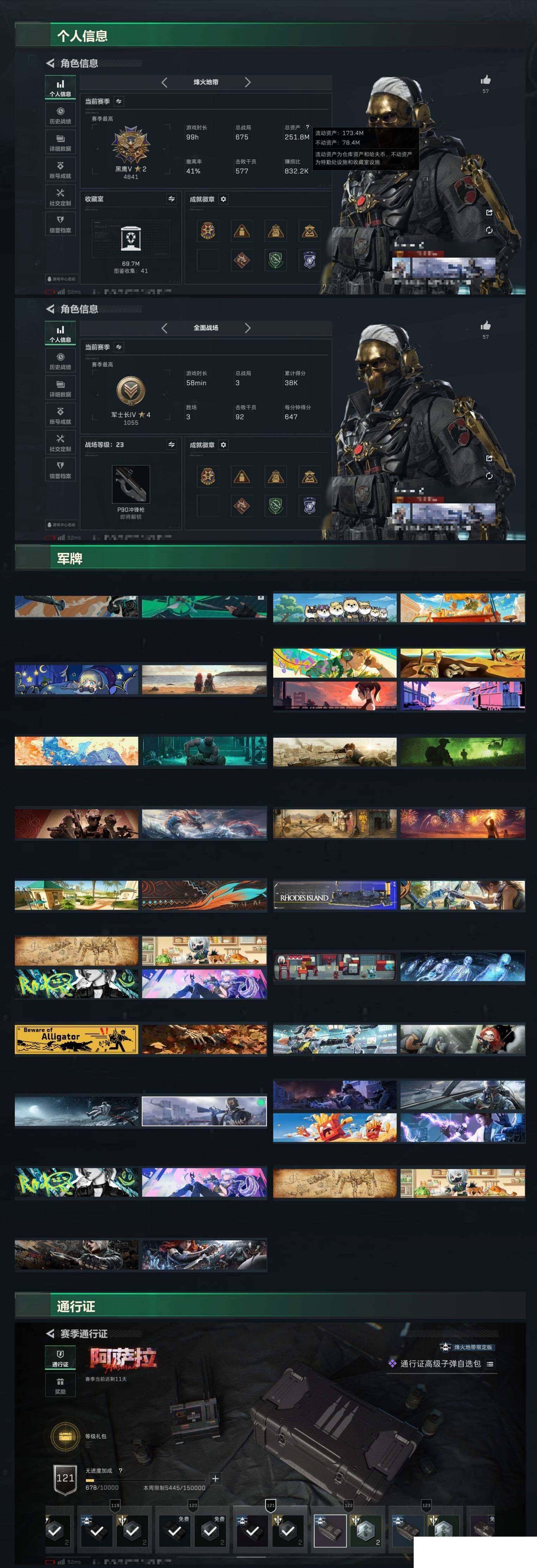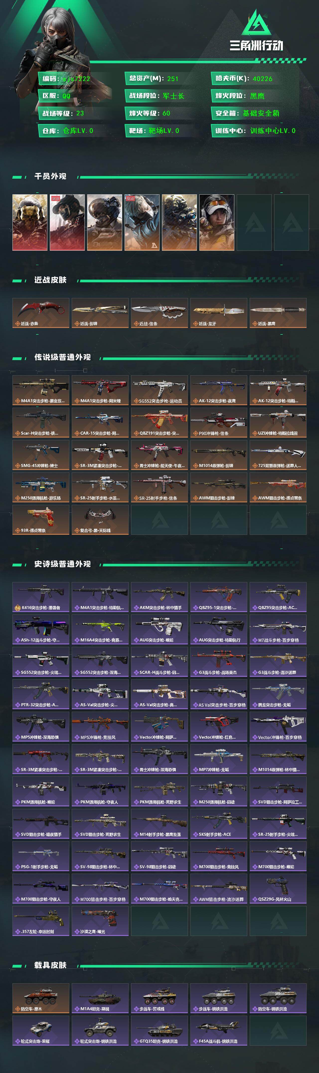 赤霄 龙牙 影锋 信条 天际线 红狼 烽火地带段位: 黑鹰 全面战场段位: 军士长 总资产: 251000000 哈夫币: 40226000