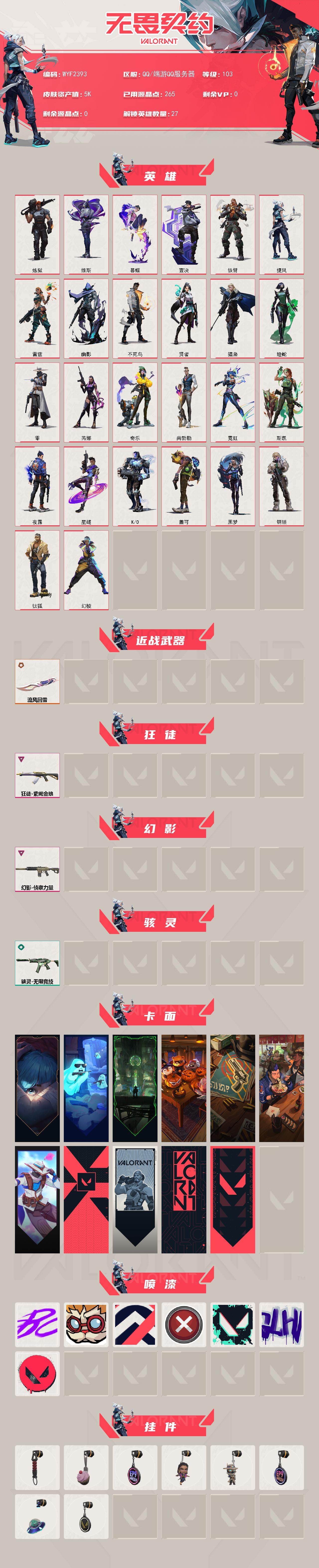 【WYF2393】终极*1/卓越*2/皮肤*7/等级*103/段位:青铜/幻棱/炼狱/维斯/暮蝶/钛狐/壹决/铁臂/捷风/雷兹/幽影/不死鸟/贤者/猎枭/蝰蛇/零/芮娜/奇乐/尚勃勒/霓虹/斯凯/夜露/星礈/K/O/盖可/黑梦/钢锁/近战武器-流风回雪/狂徒-紫阙金琅/幻影-侦察力量/骇灵-无限竞技/《双城之战》拥抱 卡面/精灵大战 卡面/欢迎来到底城 卡面/南瓜盛典 卡面/正义的化身 卡面/趁热吃 卡面/无畏契约GO!第一卷:零 卡面/代号红色 卡面/新兵报到 卡面/V契约 卡面/无畏契约 卡