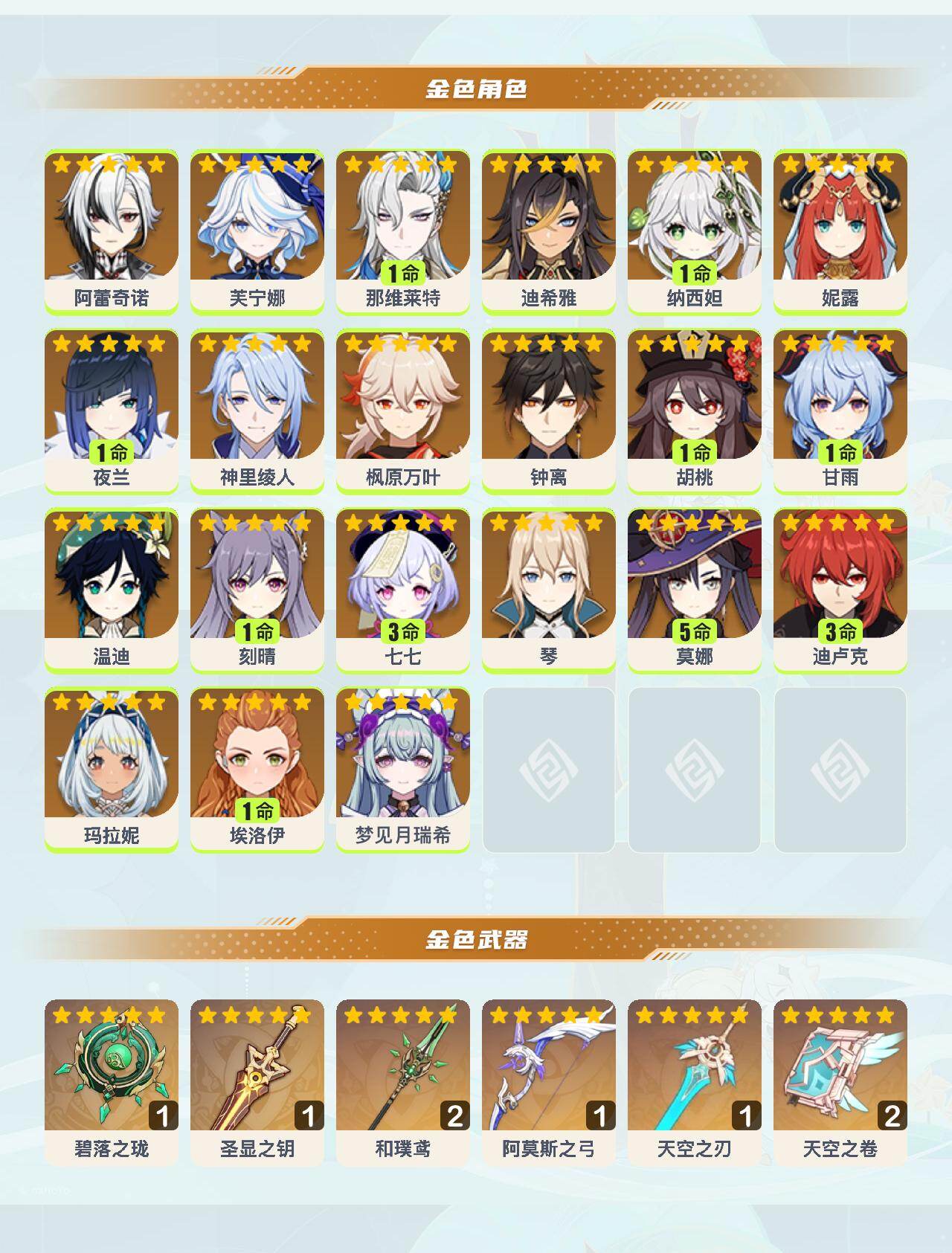 【YSF1559】60级/46黄/女主/21个五星角色/6个五星武器/钟离/枫原万叶/温迪/1命胡桃/1命甘雨/1命纳西妲/玛拉妮/芙宁娜/1命那维莱特/妮露/神里绫人/1命夜兰/5命莫娜/阿蕾奇诺/1命刻晴/迪希雅/3命迪卢克/琴/梦见月瑞希/3命七七/0命埃洛伊/阿莫斯之弓/碧落之珑/精2天空之卷/精2和璞鸢/圣显之钥/天空之刃