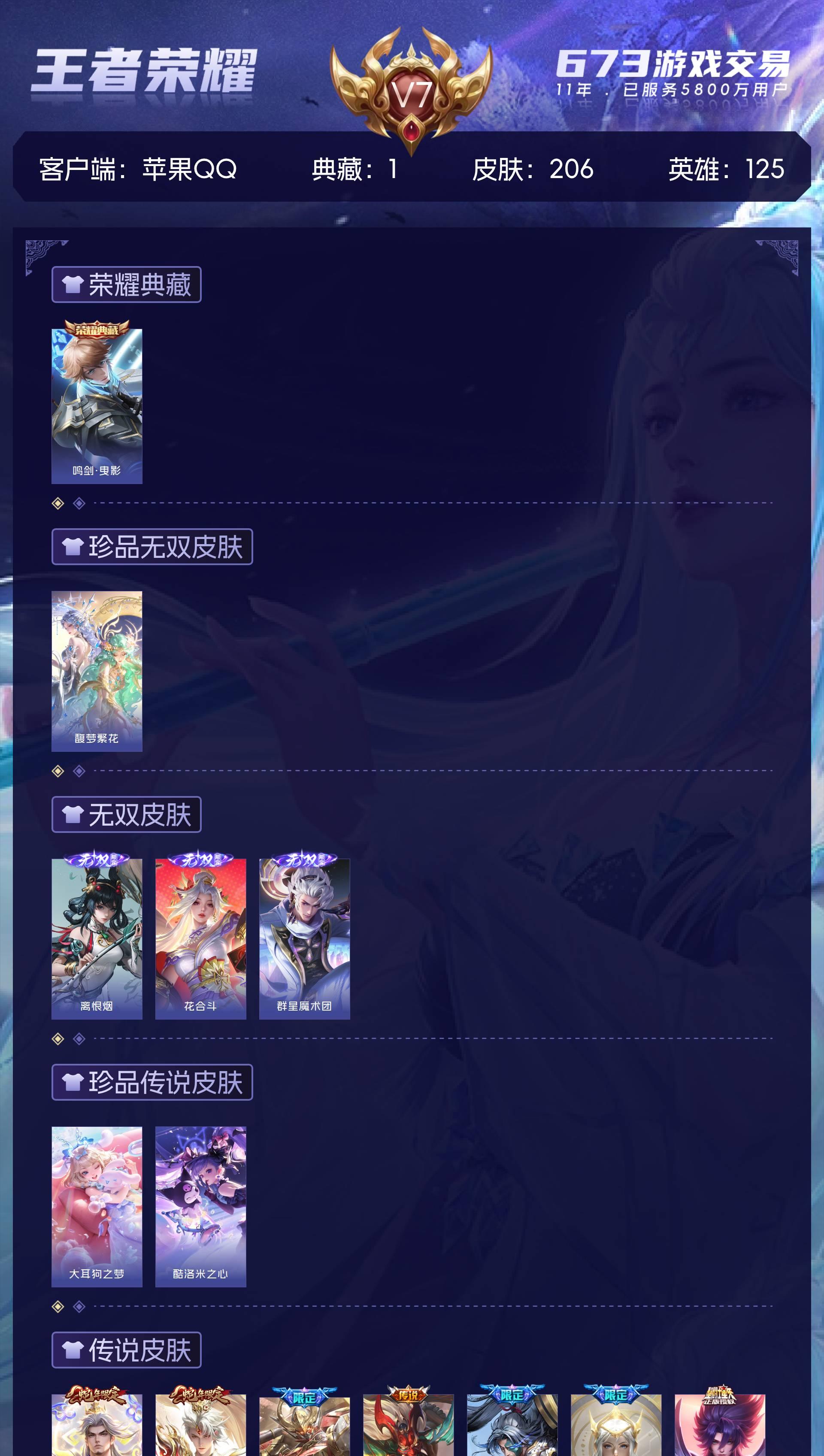 苹果QQ/最强王者/206皮肤/125英雄/1典藏/1珍品无双/3无双/2珍品传说/18传说/47史