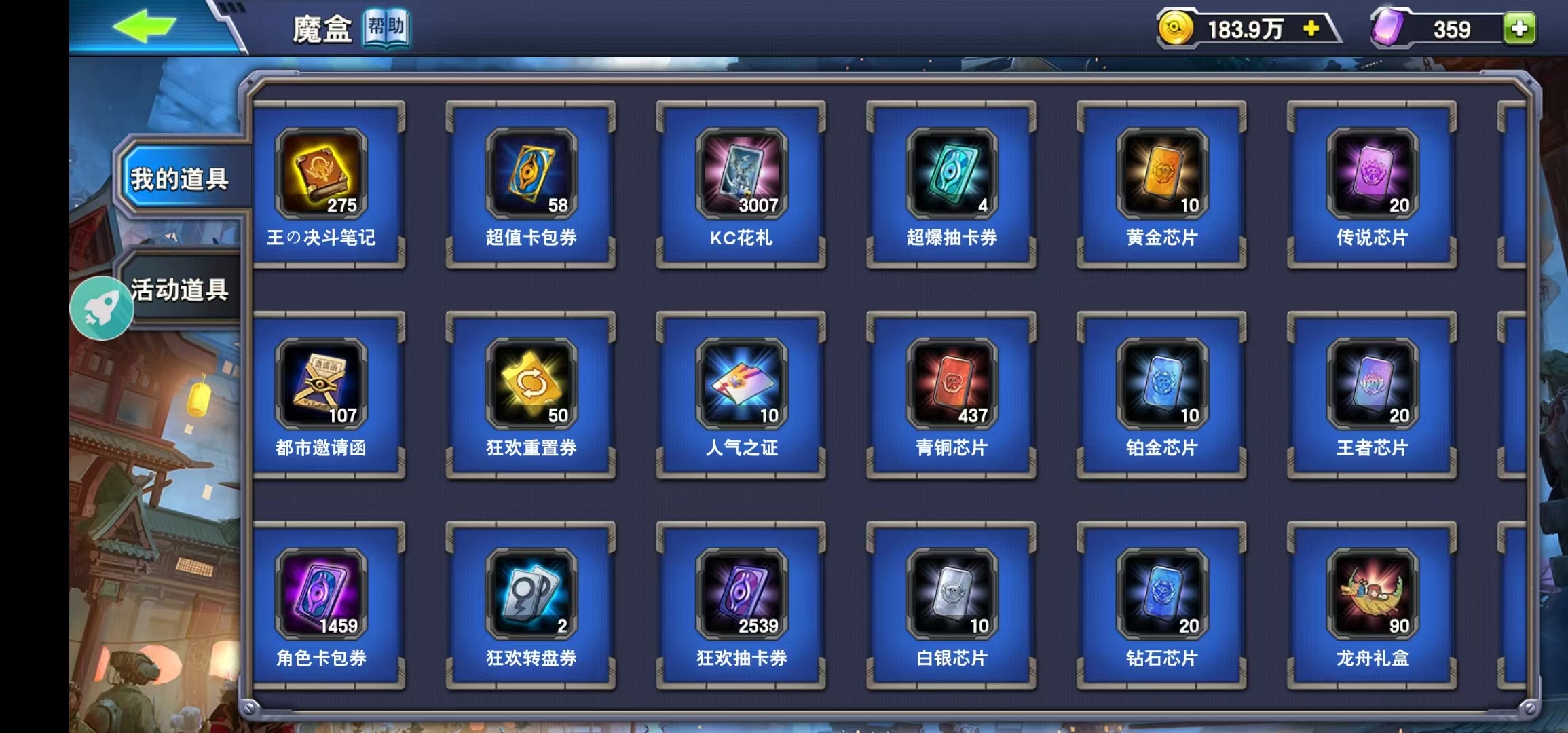 编号30,金币183万,超值劵58张(30张必出一张指定卡),狂欢劵2539,超爆劵4,指示物1,竞技黑暗都市邀请函都有好多,几百决斗笔记,几百虚无宝石,无绑手机无实名,三无账号