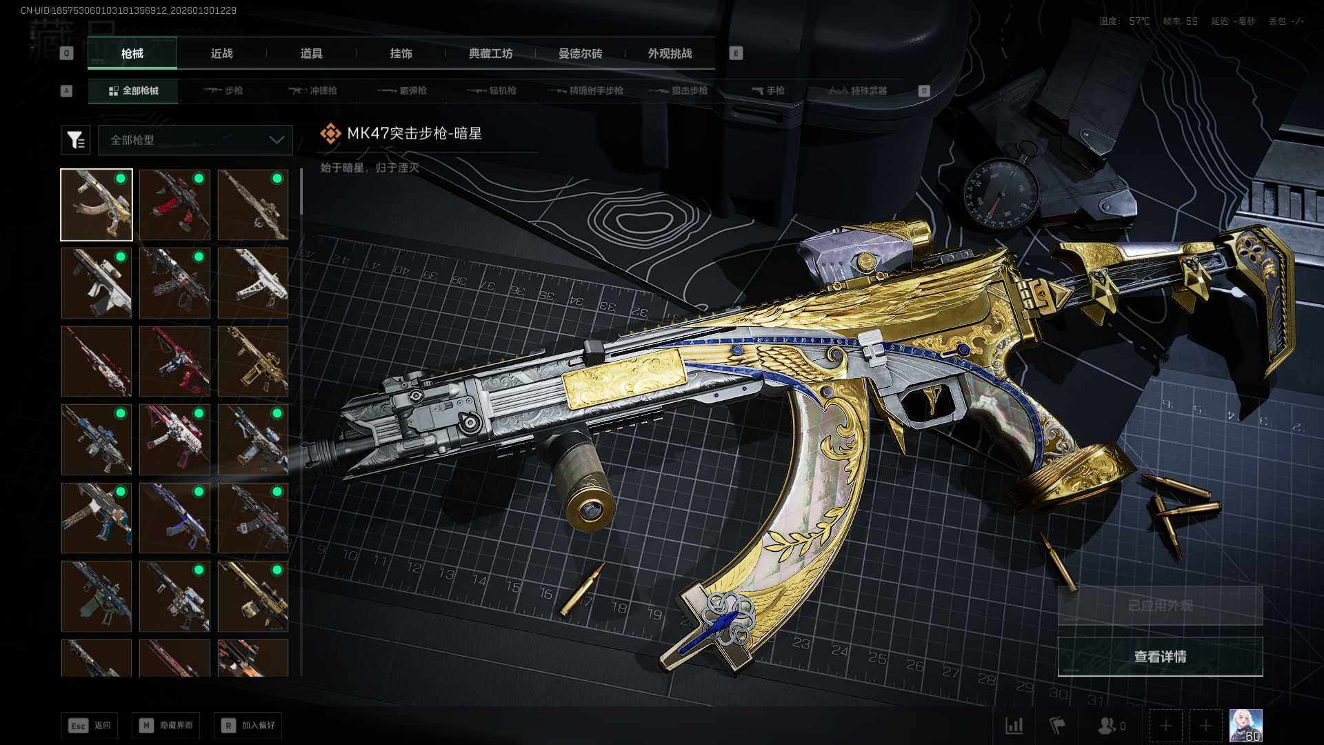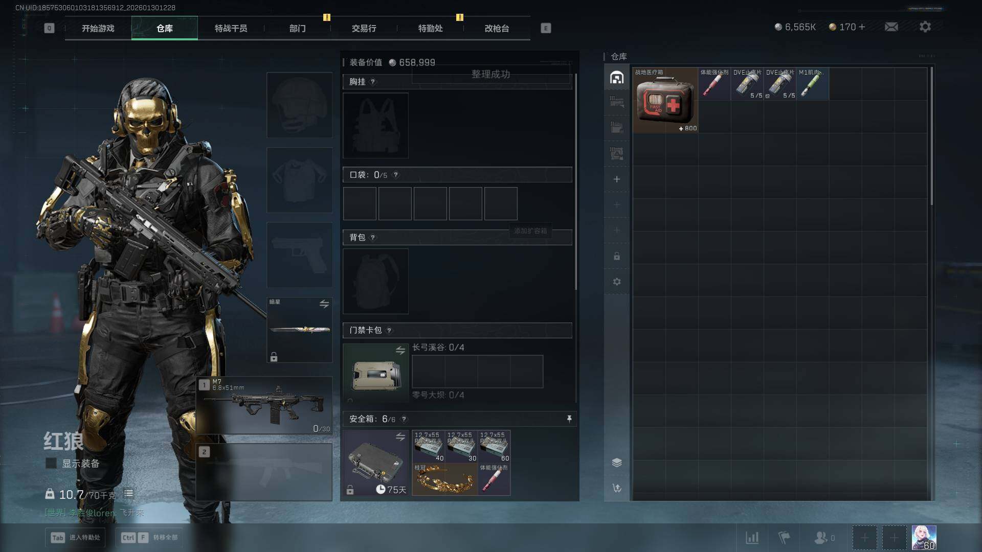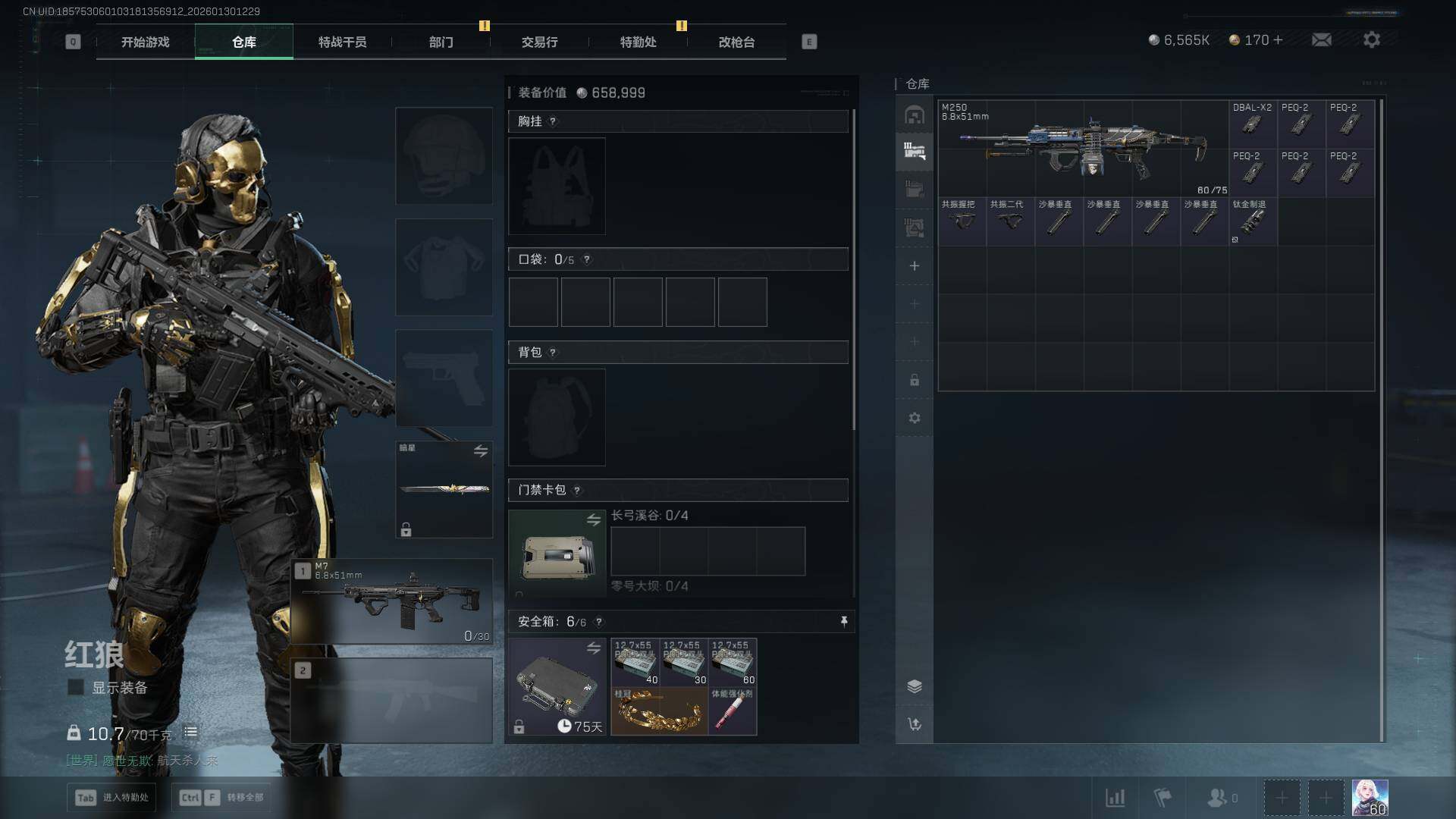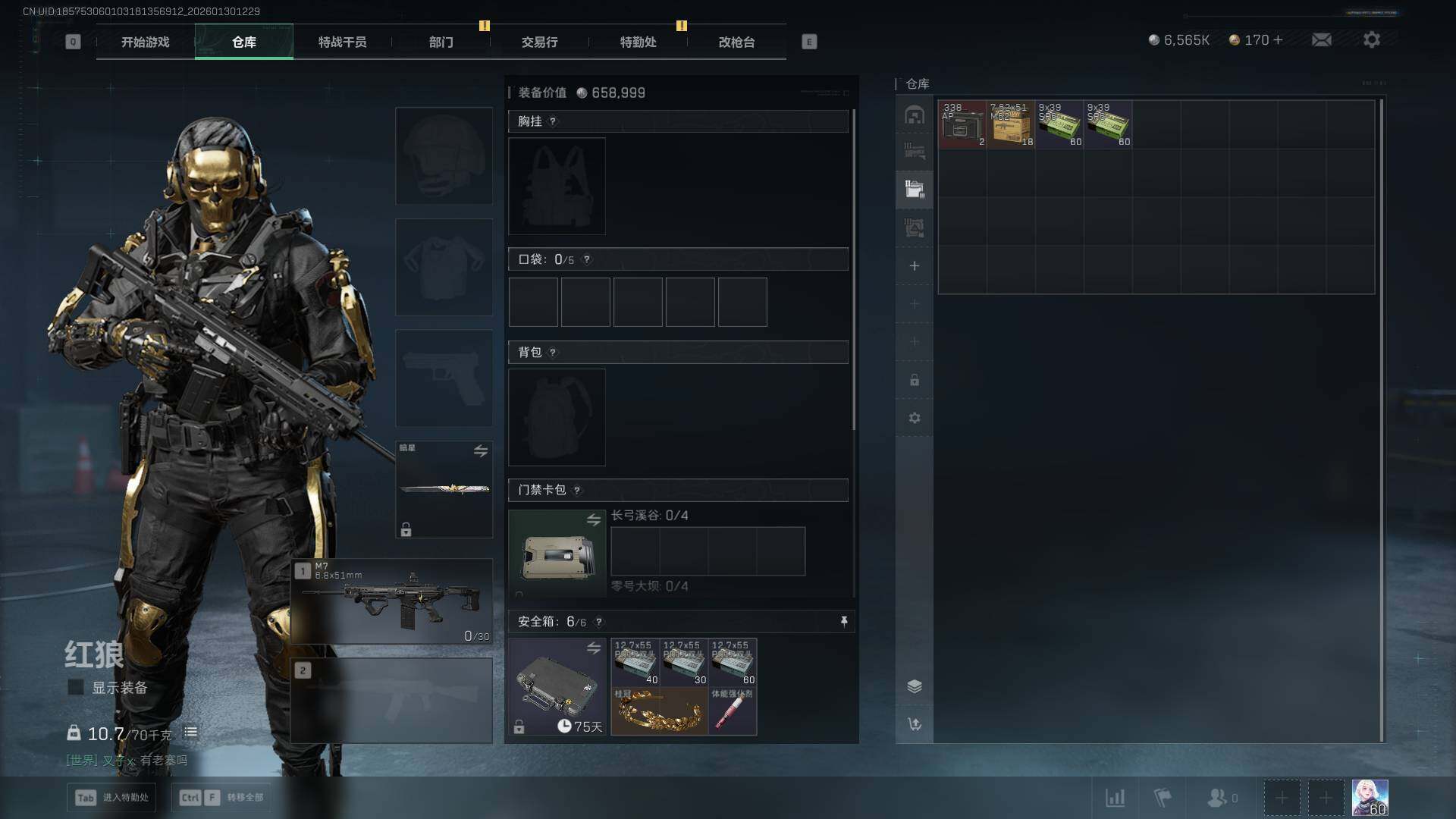 【SJZF5403】总资产(M):22M/哈夫币(K):6565K/哈夫币(K):6565K/传说枪皮数:21/全面战场等级:28_段位:列兵/烽火地带等级:60_段位:钻石/红狼-蚀金玫瑰/骇爪-水墨云图/骇爪-维什戴尔/威龙-壮志凌云/威龙-蛟龙特战队/牧羊人-街头之王/无名-夜鹰/深蓝-不破誓约/红狼-电锯惊魂/露娜-金牌射手/近战-暗星/近战-黑鹰/M4A1突击步枪-蚀金玫瑰/M4A1突击步枪-阿米娅/ASh-12战斗步枪-怜悯/M7战斗步枪-神秘艺术/M7战斗步枪-维京/SG552突击