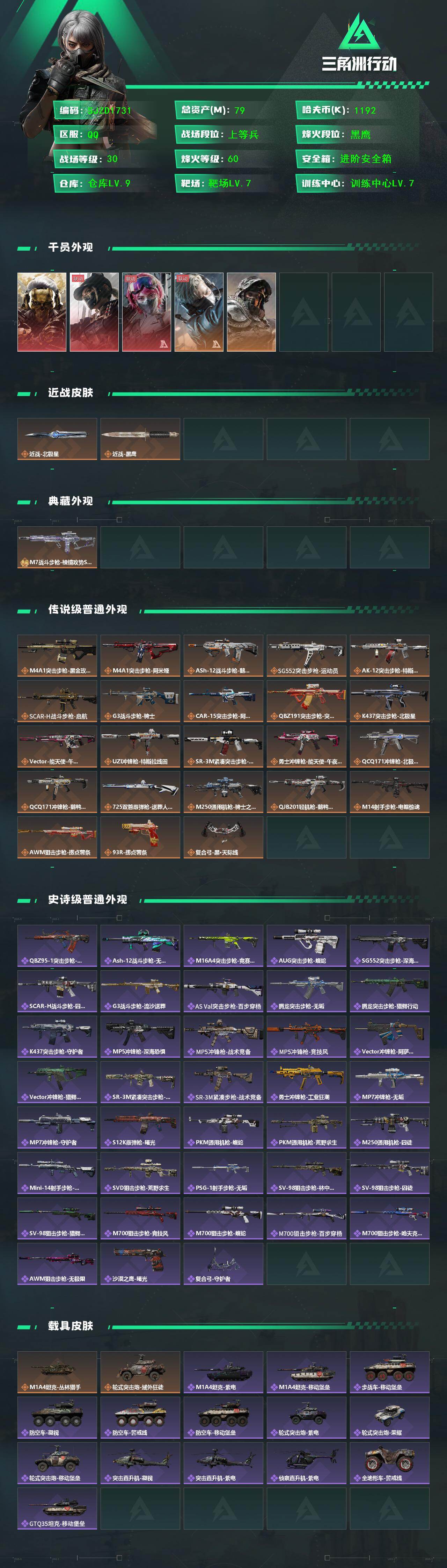 【SJZD1731】总资产(M):79M/哈夫币(K):1192K/哈夫币(K):1192K/传说枪皮数:24/全面战场等级:30_段位:上等兵/烽火地带等级:60_段位:黑鹰/红狼-蚀金玫瑰/露娜-黑·天际线/蛊-能天使午夜邮差/蜂医-送葬人·无题密令/深蓝-不破誓约/近战-北极星/近战-黑鹰/M7战斗步枪-棱镜攻势S2/M4A1突击步枪-蚀金玫瑰/M4A1突击步枪-阿米娅/ASh-12战斗步枪-鹅鸭杀/SG552突击步枪-运动员/AK-12突击步枪-特斯拉线圈/SCAR-H战斗步枪-启航/G