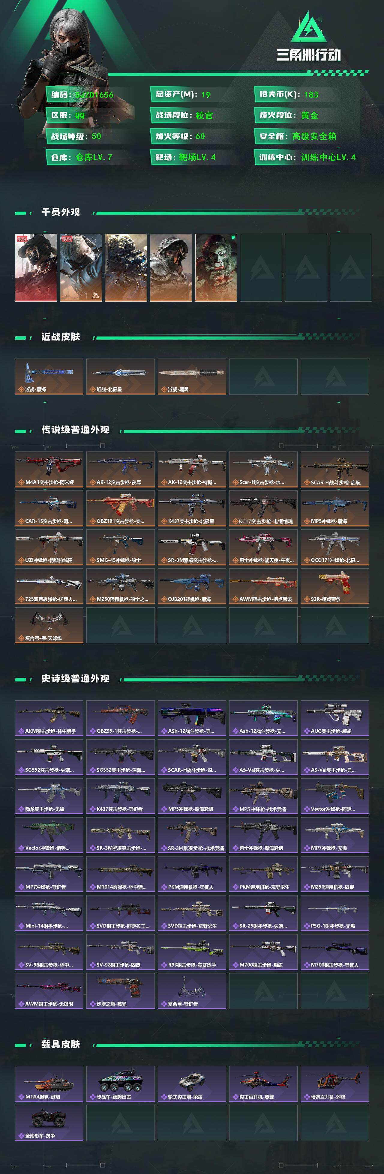 【SJZD1656】总资产(M):19M/哈夫币(K):183K/哈夫币(K):183K/传说枪皮数:21/全面战场等级:50_段位:校官/烽火地带等级:60_段位:黄金/露娜-黑·天际线/蜂医-送葬人·无题密令/无名-夜鹰/深蓝-不破誓约/红狼-电锯惊魂/近战-黑海/近战-北极星/近战-黑鹰/M4A1突击步枪-阿米娅/AK-12突击步枪-夜鹰/AK-12突击步枪-特斯拉线圈/SCAR-H战斗步枪-水墨云图/SCAR-H战斗步枪-启航/CAR-15突击步枪-阿米娅/腾龙突击步枪-捞点薯条/K43