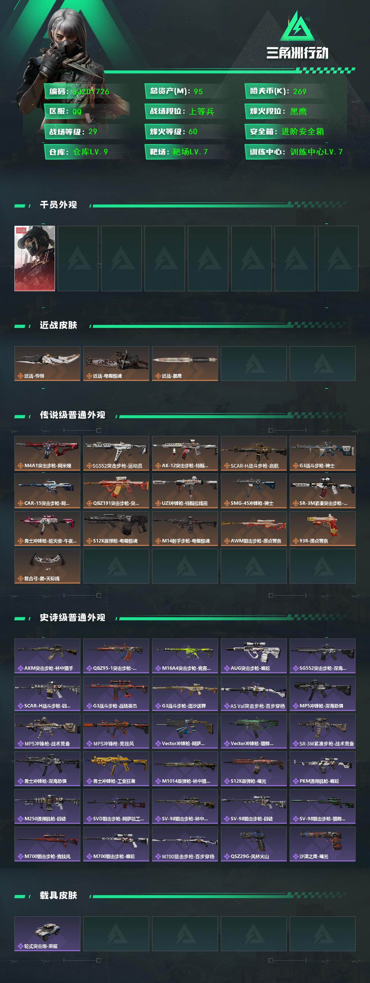 【SJZD1726】总资产(M):95M/哈夫币(K):269K/哈夫币(K):269K/传说枪皮数:16/全面战场等级:29_段位:上等兵/烽火地带等级:60_段位:黑鹰/露娜-黑·天际线/近战-怜悯/近战-电锯惊魂/近战-黑鹰/M4A1突击步枪-阿米娅/SG552突击步枪-运动员/AK-12突击步枪-特斯拉线圈/SCAR-H战斗步枪-启航/G3战斗步枪-骑士/CAR-15突击步枪-阿米娅/腾龙突击步枪-捞点薯条/UZI冲锋枪-特斯拉线圈/SMG-45冲锋枪-骑士/SR-3M紧凑突击步枪-特斯