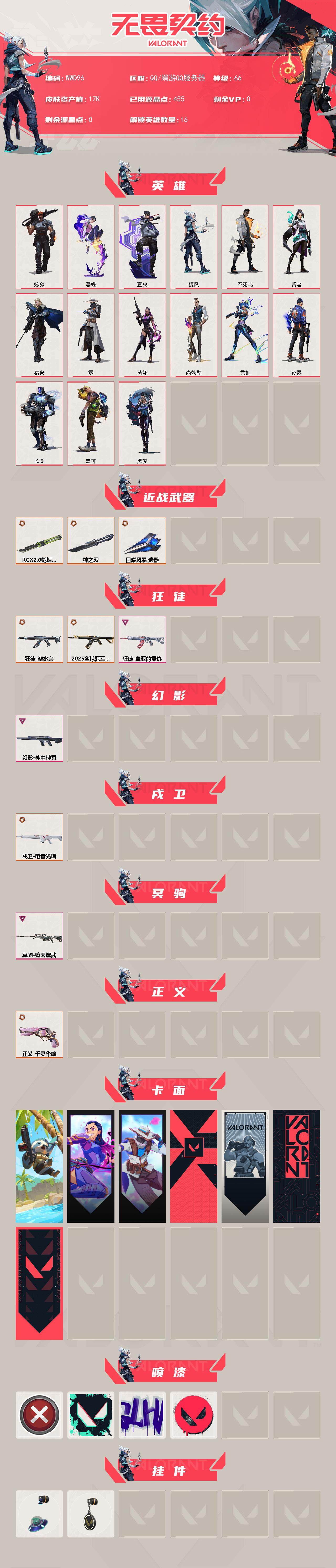 【WWD96】终极*7/卓越*3/皮肤*33/等级*66/段位:未定级/炼狱/暮蝶/壹决/捷风/不死鸟/贤者/猎枭/零/芮娜/尚勃勒/霓虹/夜露/K/O/盖可/黑梦/近战武器-神之刃/近战武器-RGX 11z Pro//2.0 蝴蝶刀/近战武器-日耀风暴 遗器/狂徒-2025全球冠军赛/狂徒-塑水宗/狂徒-盖亚的复仇/幻影-神中神罚/戍卫-电音光谱/冥驹-堕天遗武/正义-千灵华绽/树懒大作战 卡面/无畏契约GO!第一卷:芮娜 卡面/无畏契约GO!第一卷:零 卡面/代号红色 卡面/新兵报到 卡面/