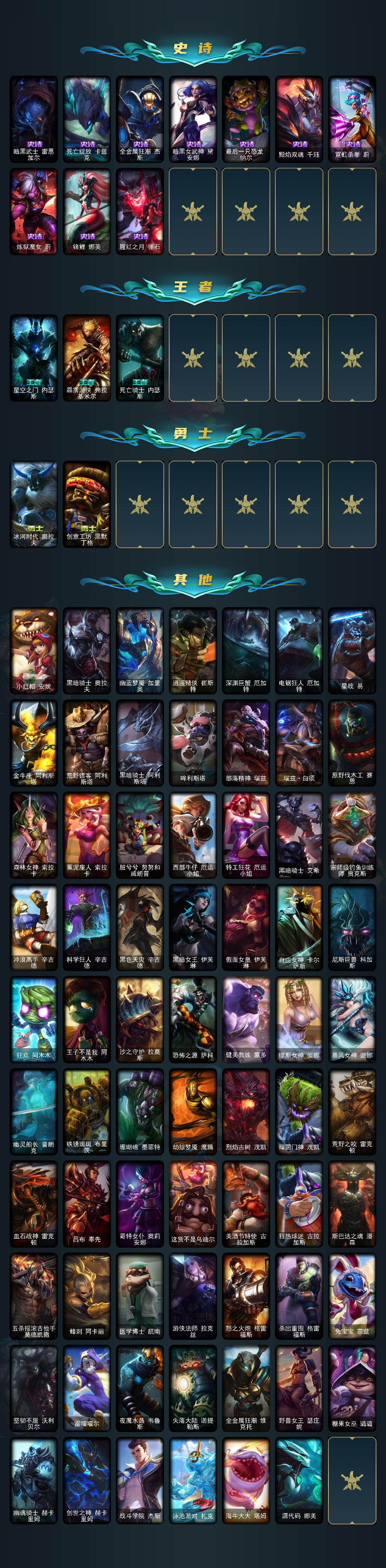 126英雄/156皮肤/1终极/2神话/19限定/1臻彩/3炫彩/15传说/45史诗/未定级